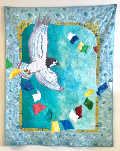 "The Messenger" - my needle-turn appliqué & hand-quilted wall tapestry - representing peace carried by The Four Winds - will be up with other artists' work depicting all the elements of The Haudenosaunee Thanksgiving Prayer, as written in the book "Braiding Sweetgrass" by Robin Wall Kimmerer.
