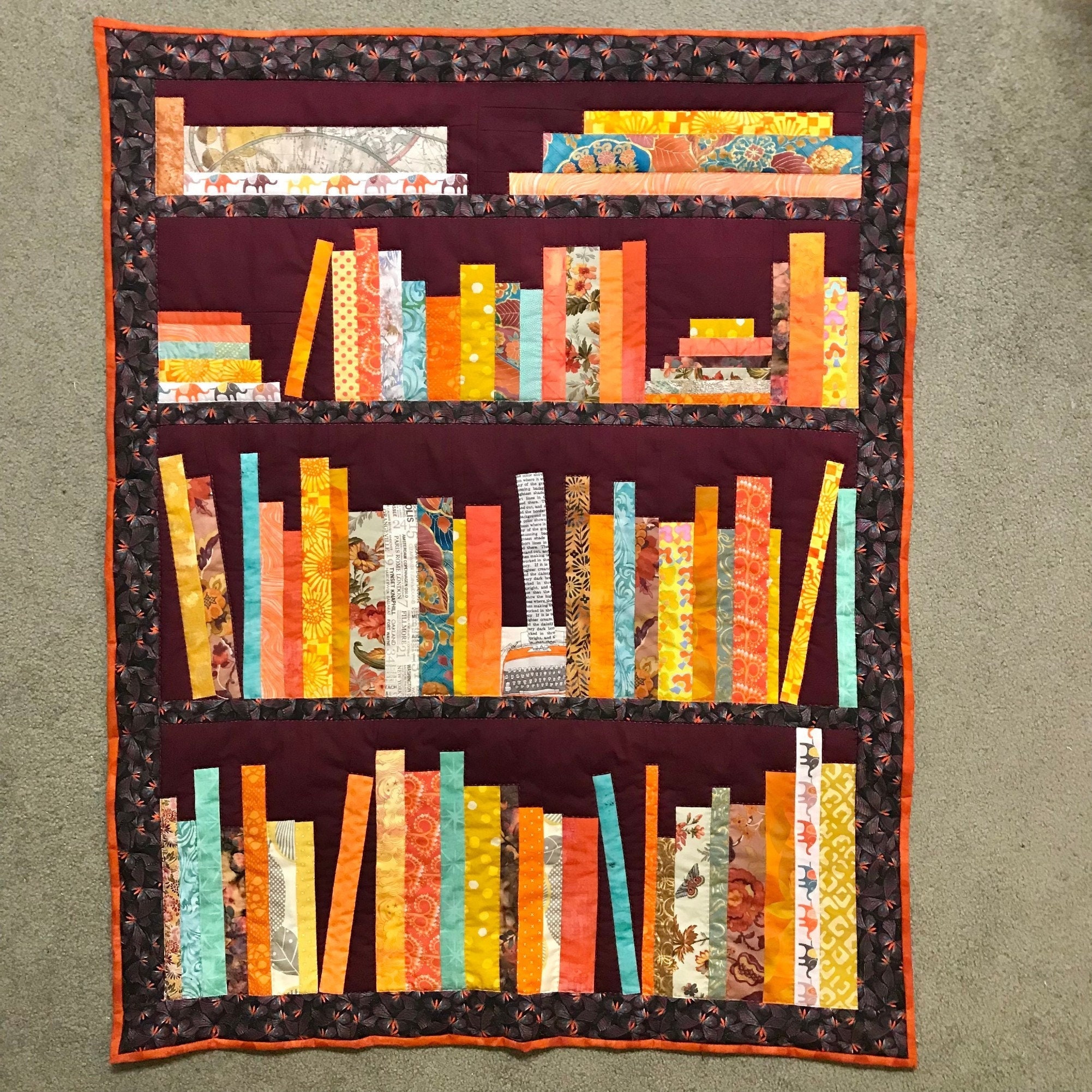 One-Of-A-Kind Book lover's Lap quilt and wall tapestry. It was handmade using my own pattern of a dark butterfly design bookcase with four shelves of books (12", 12", 8", 5") in oranges, yellows, and aqua blue cotton fabrics. Backing is a cozy large orange and white checked cotton flannel, trimmed with orange (Photos 2, 3).