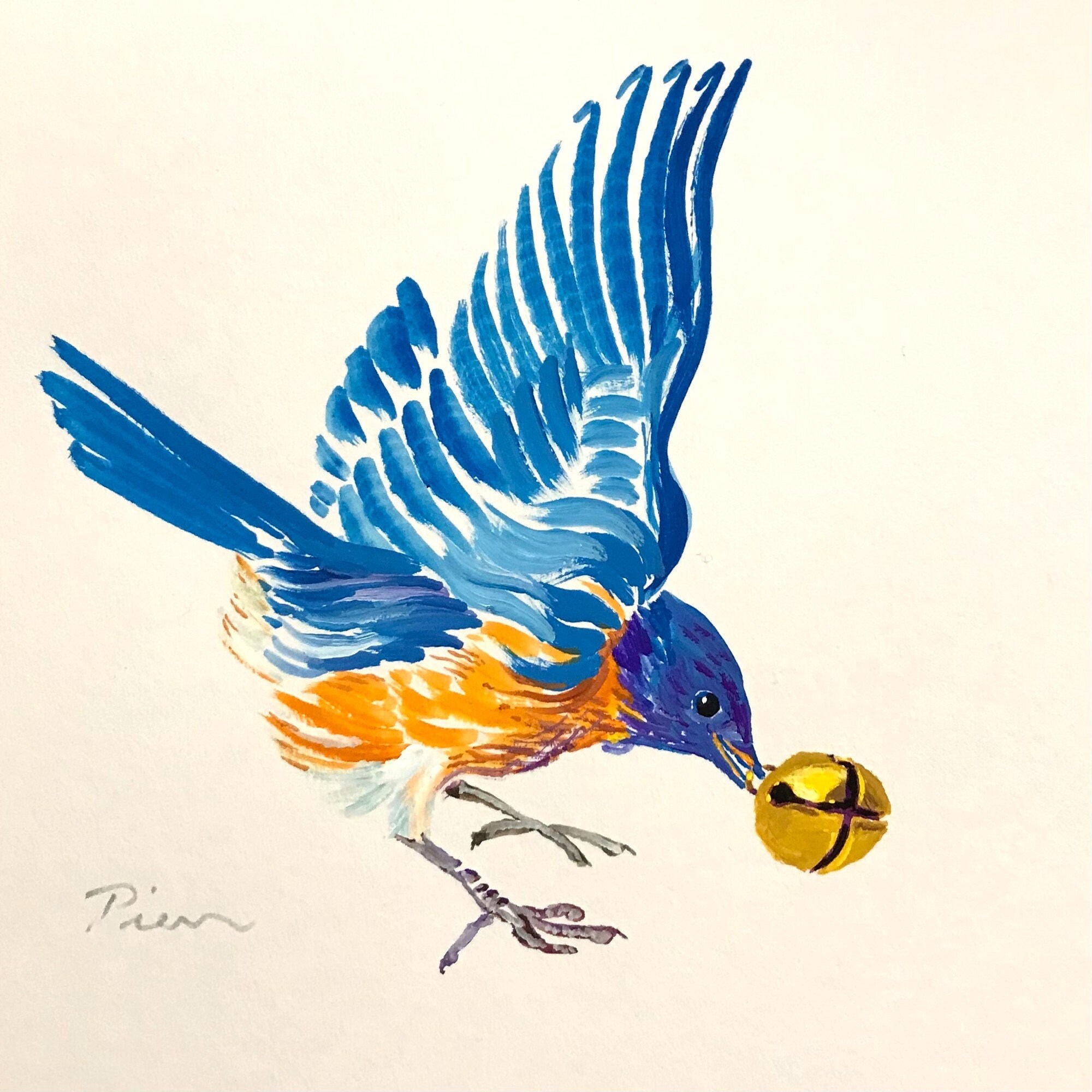 Eastern Bluebird ~ ready to fly with vintage jingle bell find