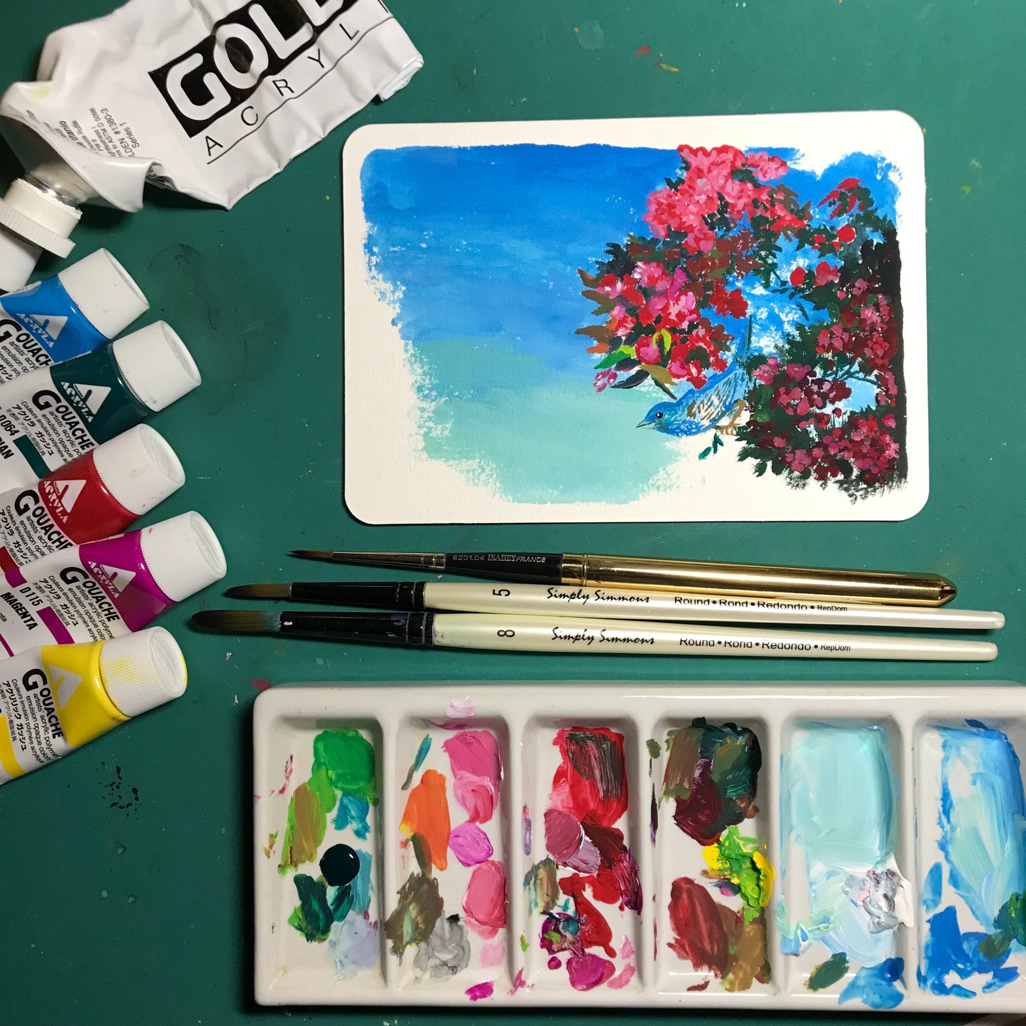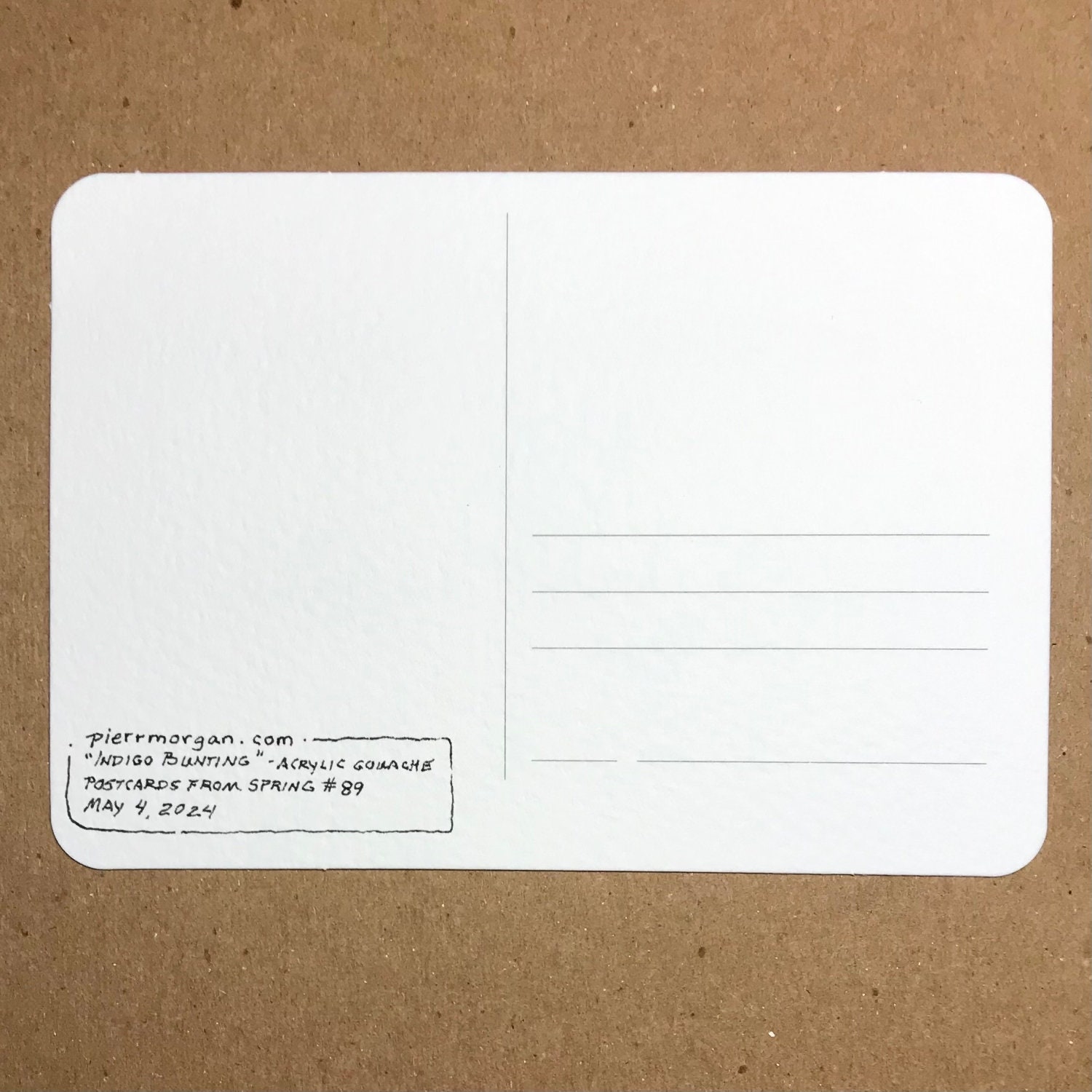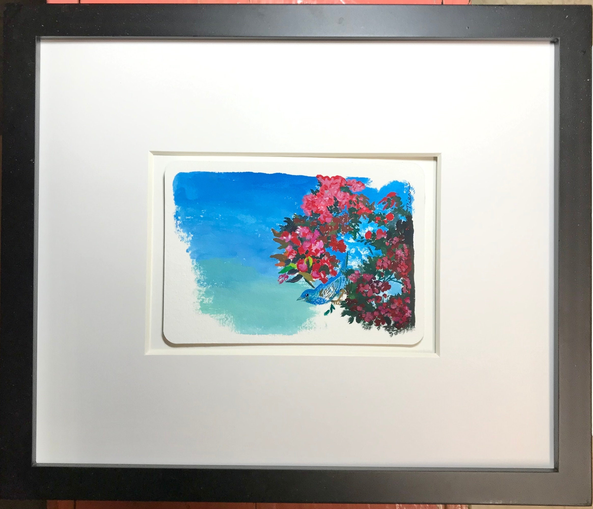 • Original Painting - (not a print) - 6x4-inches - of a blue Indigo Bunting perched in crabapple blossoms - using acrylic gouache (gooWASH - opaque watercolor), on a 300g watercolor postcard