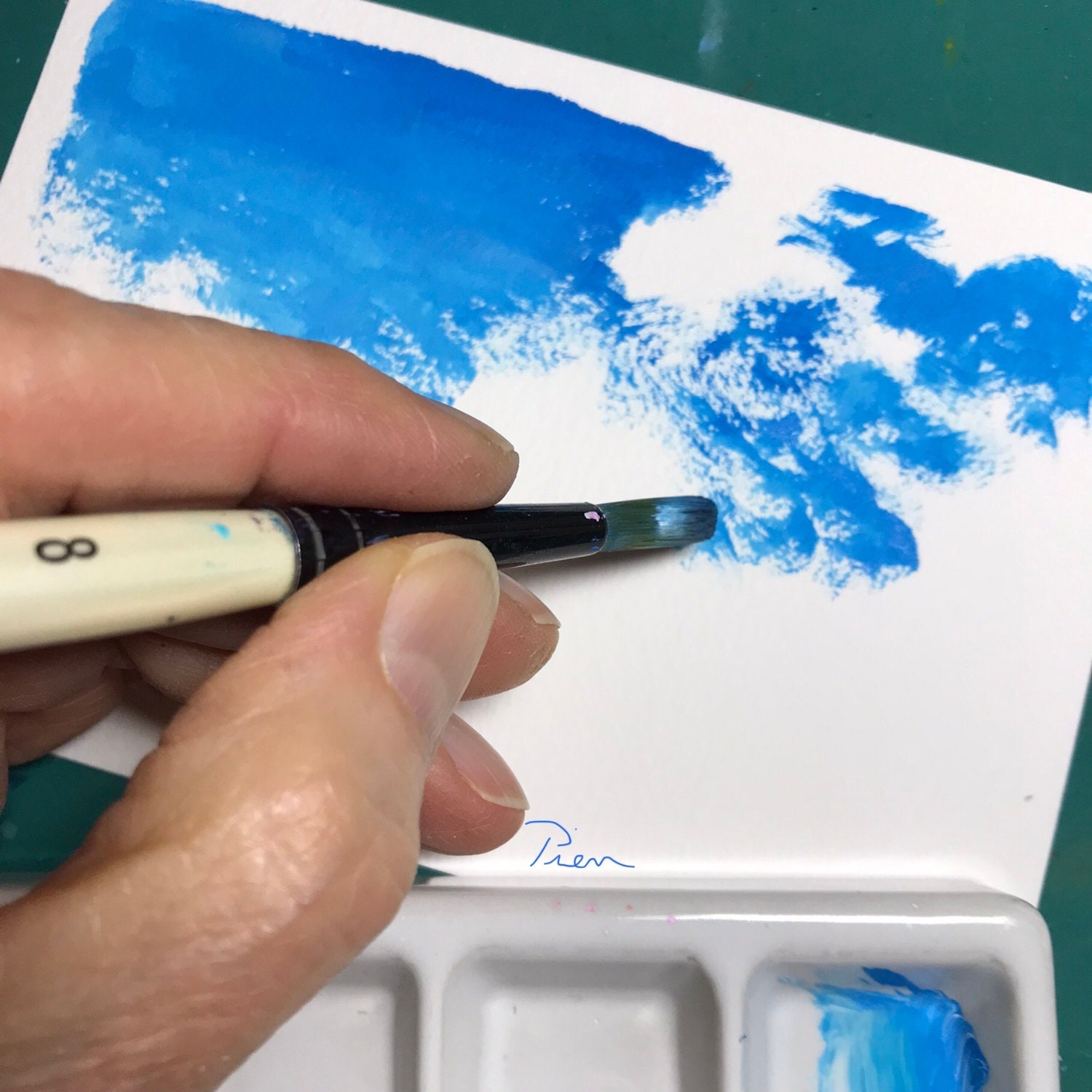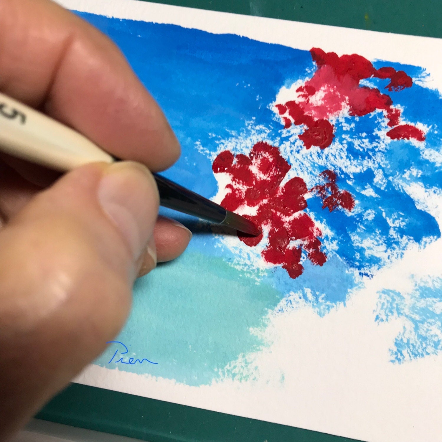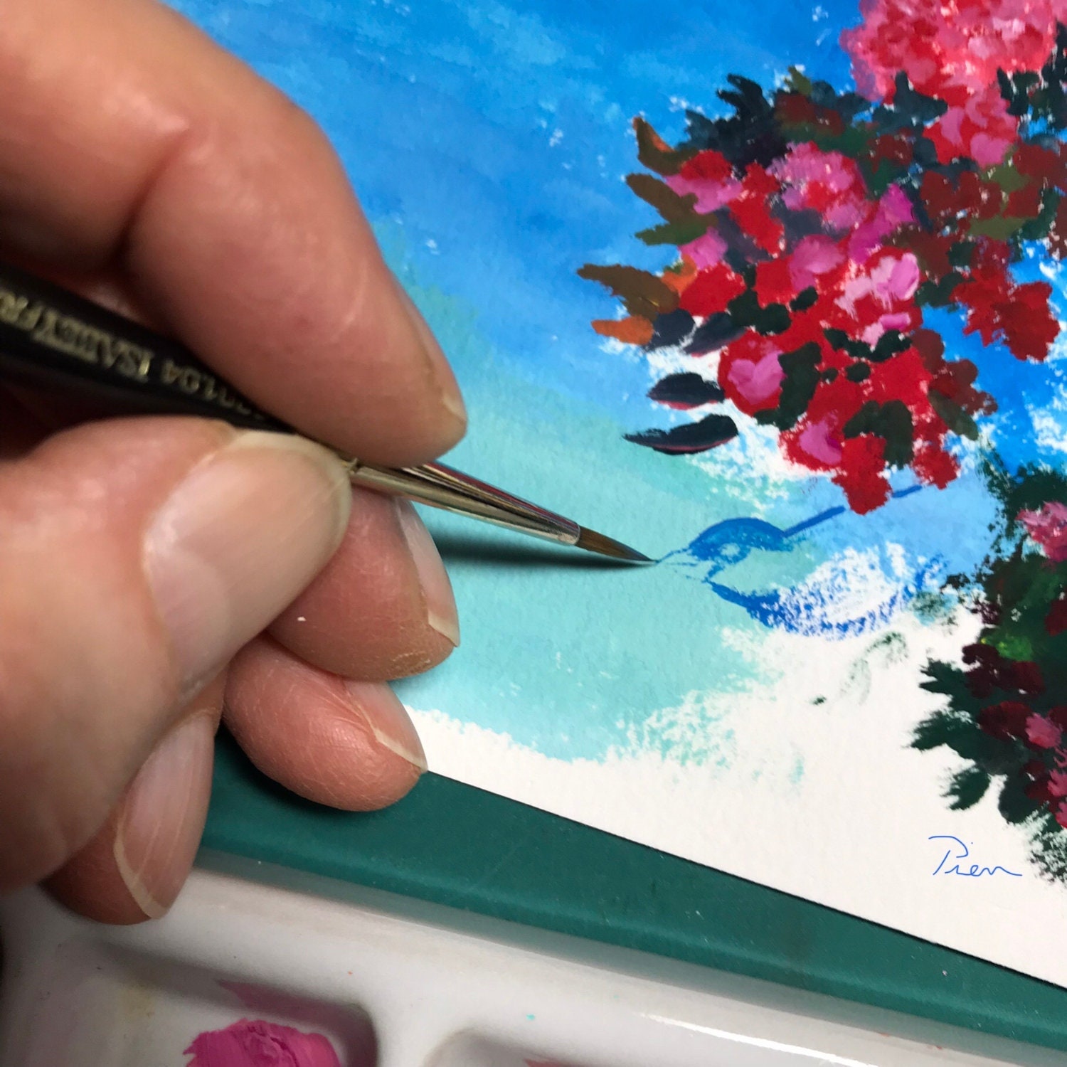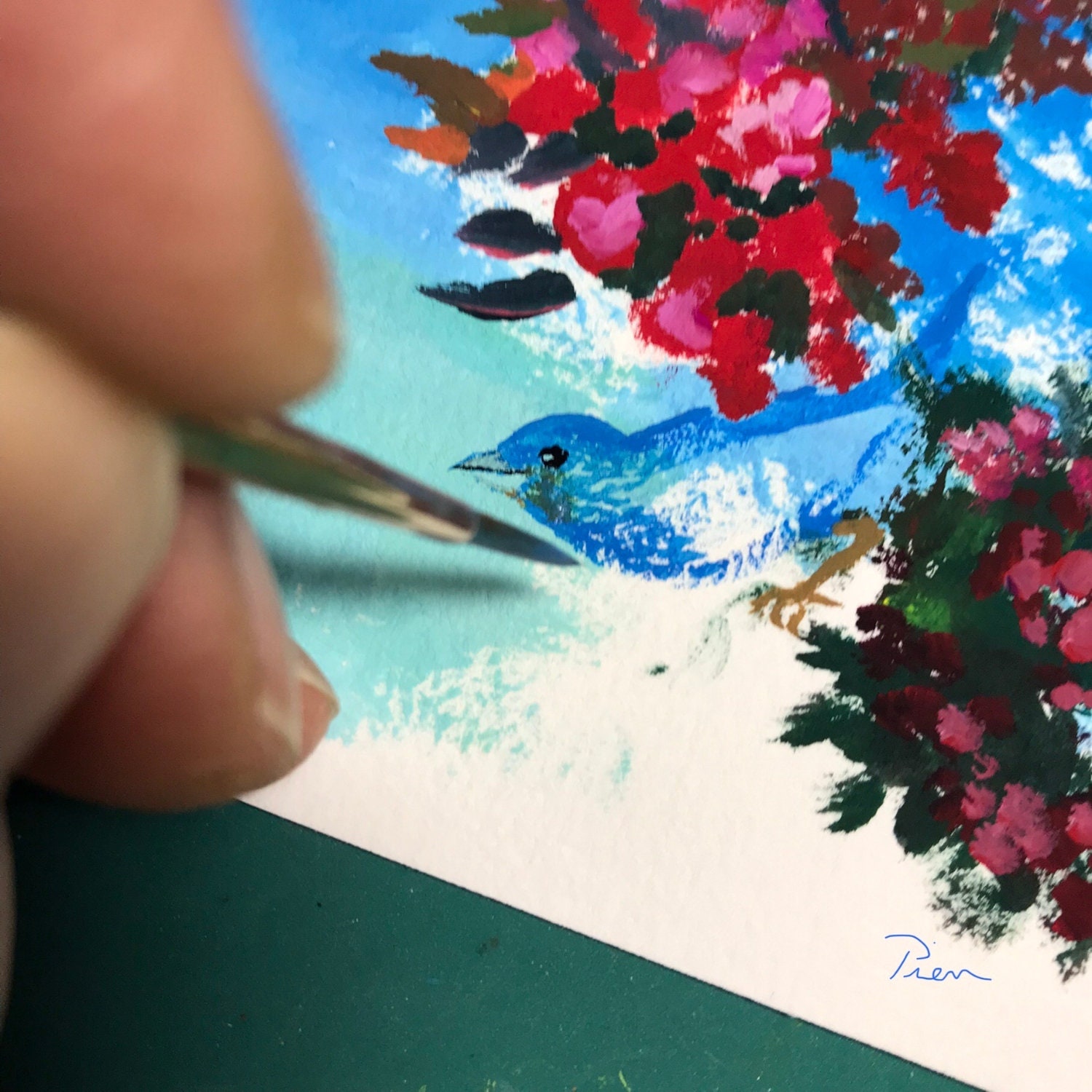 • Original Painting - (not a print) - 6x4-inches - of a blue Indigo Bunting perched in crabapple blossoms - using acrylic gouache (gooWASH - opaque watercolor), on a 300g watercolor postcard