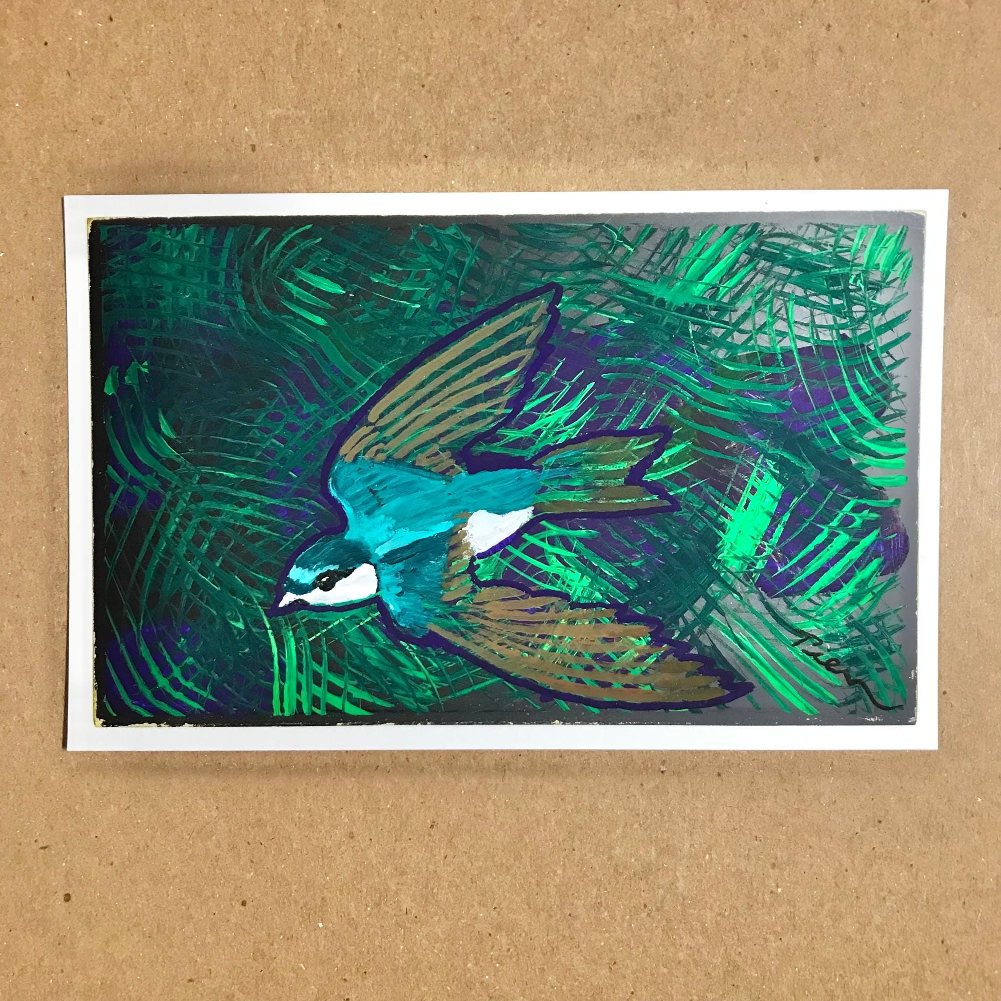 • Original Painting - (not a print) - 6x4-inches - of a flashy green and brown Swallow flying - using Posca pens & acrylic gouache (gooWASH - opaque watercolor), on a vintage Penguin book postcard