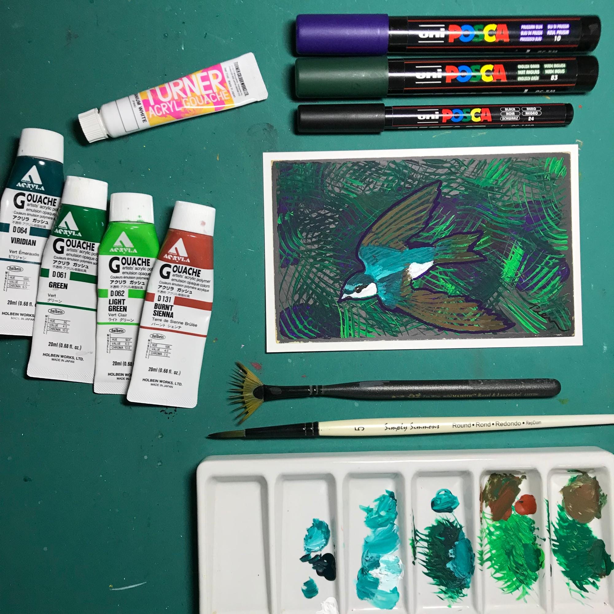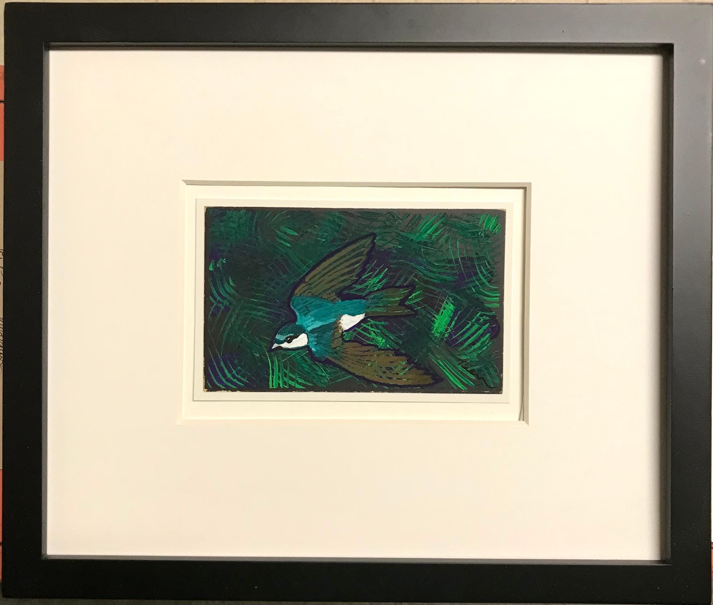 • Original Painting - (not a print) - 6x4-inches - of a flashy green and brown Swallow flying - using Posca pens & acrylic gouache (gooWASH - opaque watercolor), on a vintage Penguin book postcard