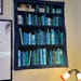 One-Of-A-Kind Book Lover's Lap quilt and wall tapestry. It was handmade using my own pattern of a dark blue 'Seeing Stars' design bookcase with four shelves (12" - 12" - 8" - 6") of books, in blue and green cotton fabrics. The backing is a cozy soft cotton blue plaid, trimmed with a royal blue dotted cotton (Photos 2, 3).