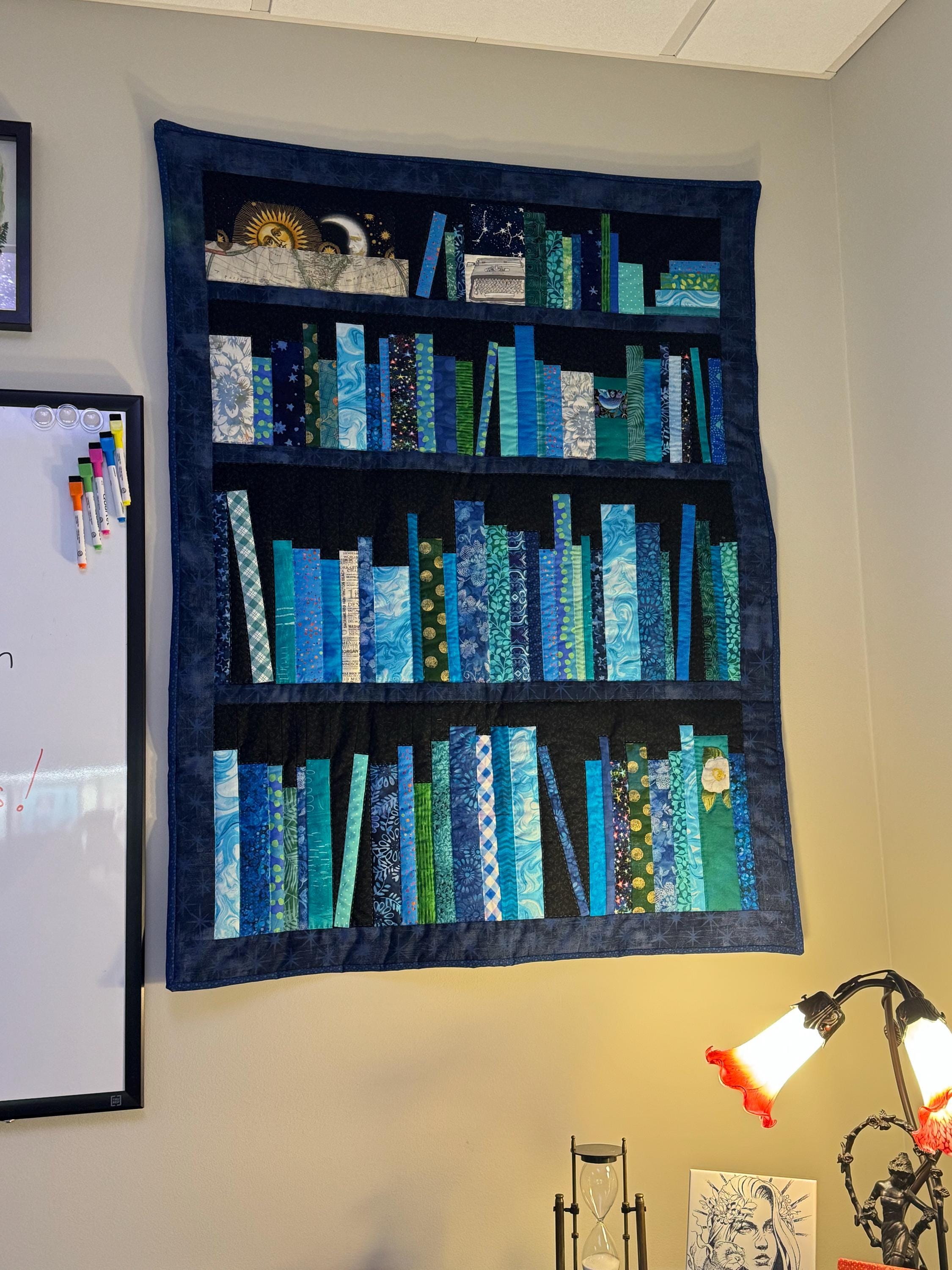 This quilt is absolutely stunning! I purchased this as a gift to myself after defending my dissertation, and it now hangs proudly in my university office. Books have always been my greatest treasures and companions, and this quilt fully encompasses all that my academic journey has meant to me. Thank you for such a beautiful work of art!