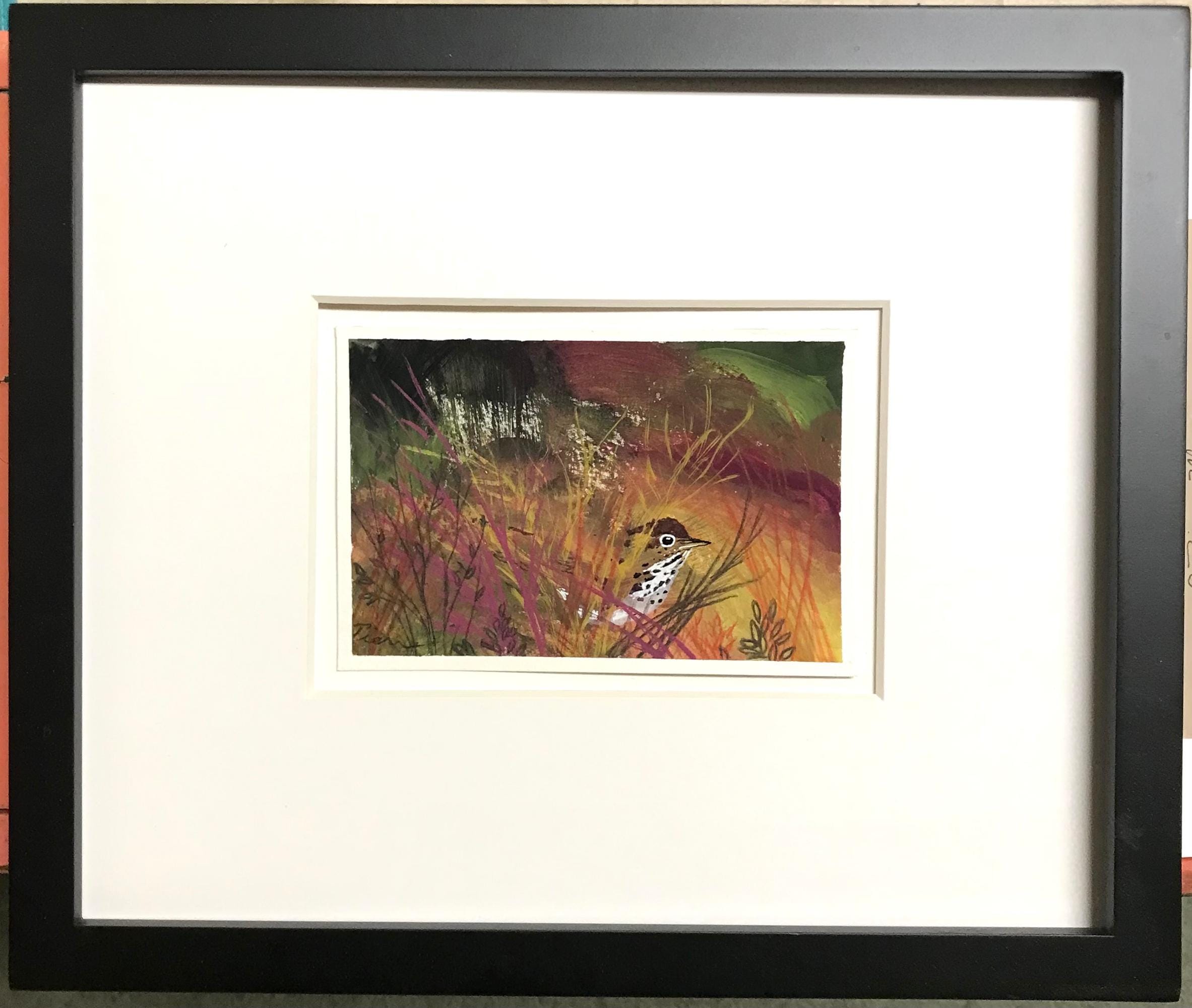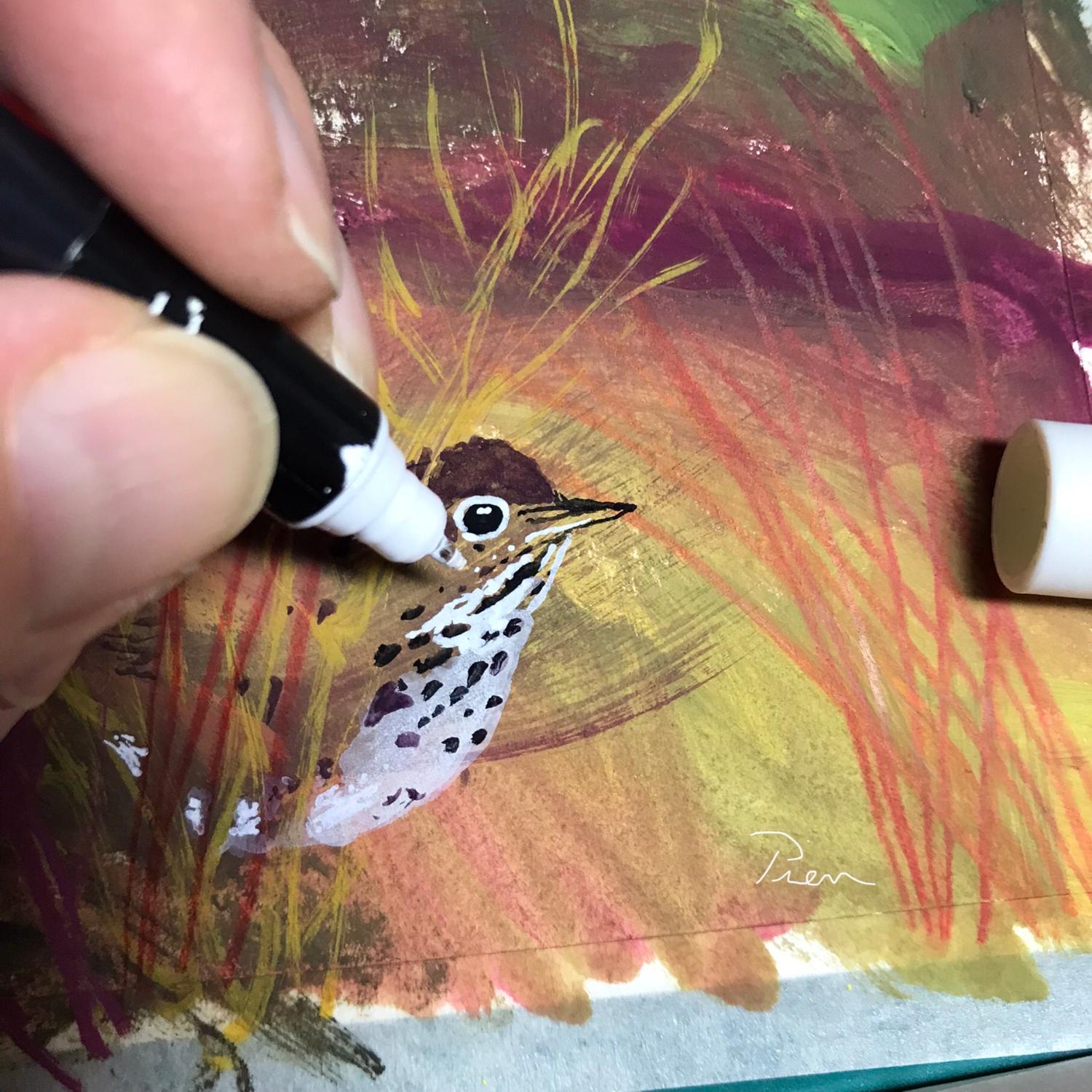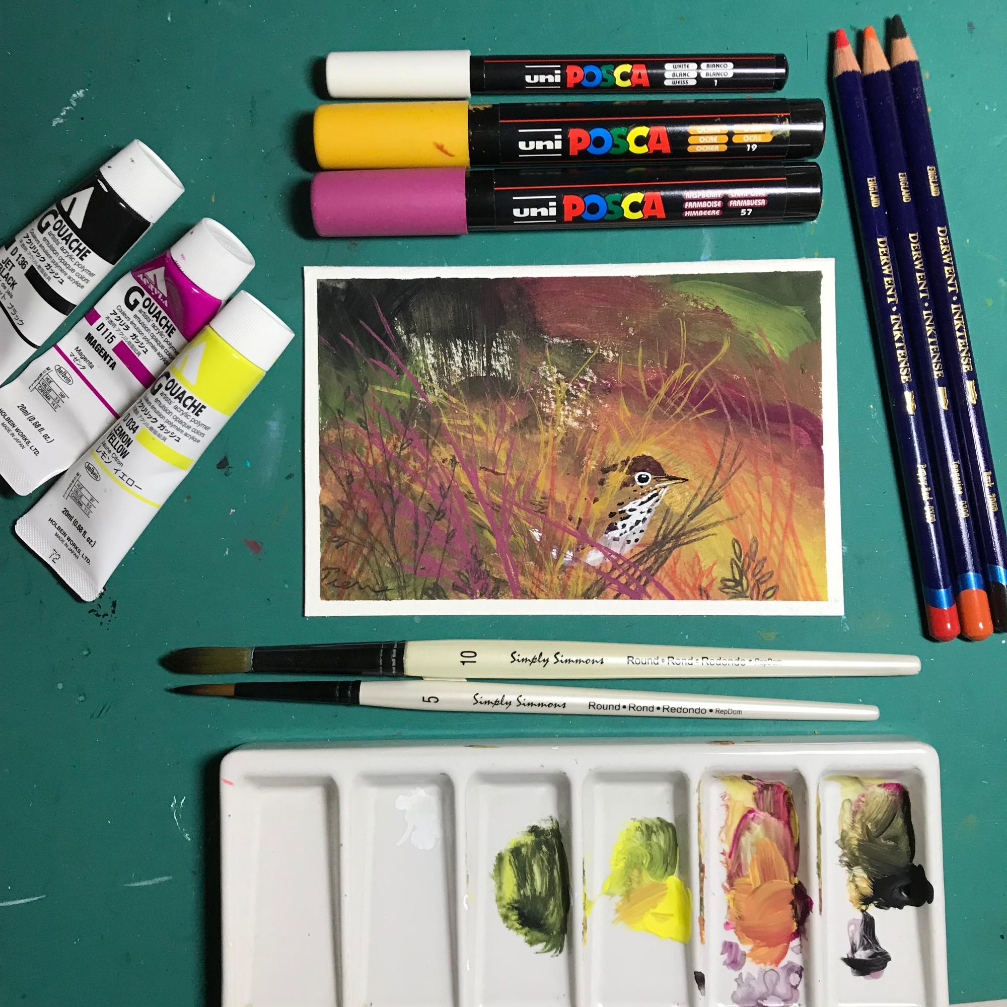 • Original Painting - (not a print) - 6x4-inches - of a Hermit Thrush peeking from a thicket - using Posca paint pens, ink pencils & acrylic-gouache (gooWASH - opaque watercolor), on a Canson 140lb watercolor postcard