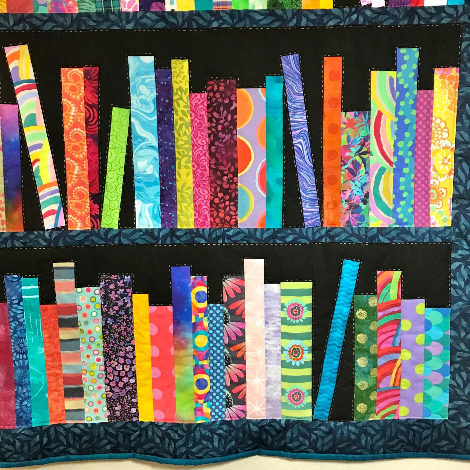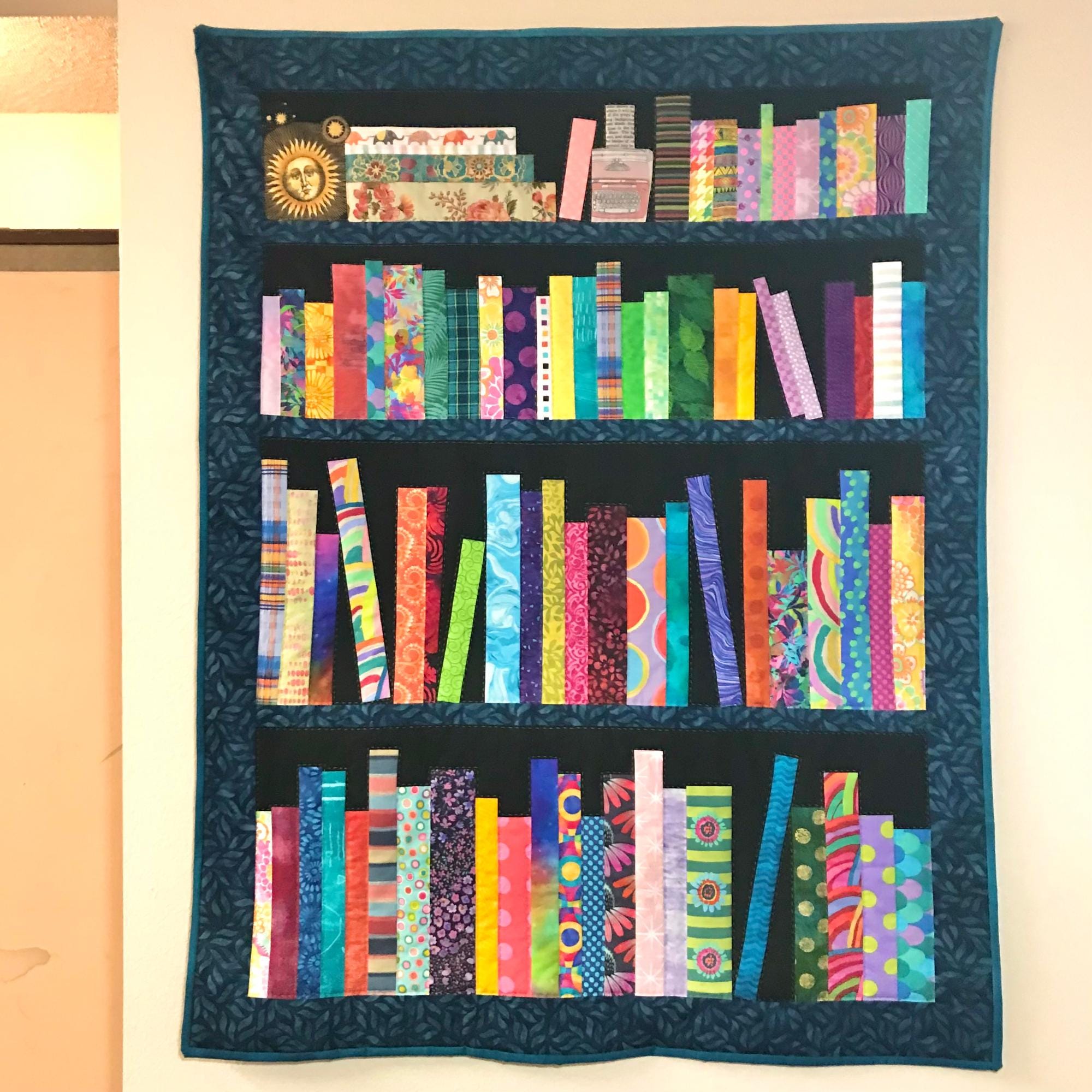 One-Of-A-Kind Book Lover's Lap quilt or wall tapestry. It was handmade using my own pattern of a dark blue batik design bookcase with four shelves of books (12" - 12" - 8" - 6") in bright colorful cotton fabrics.