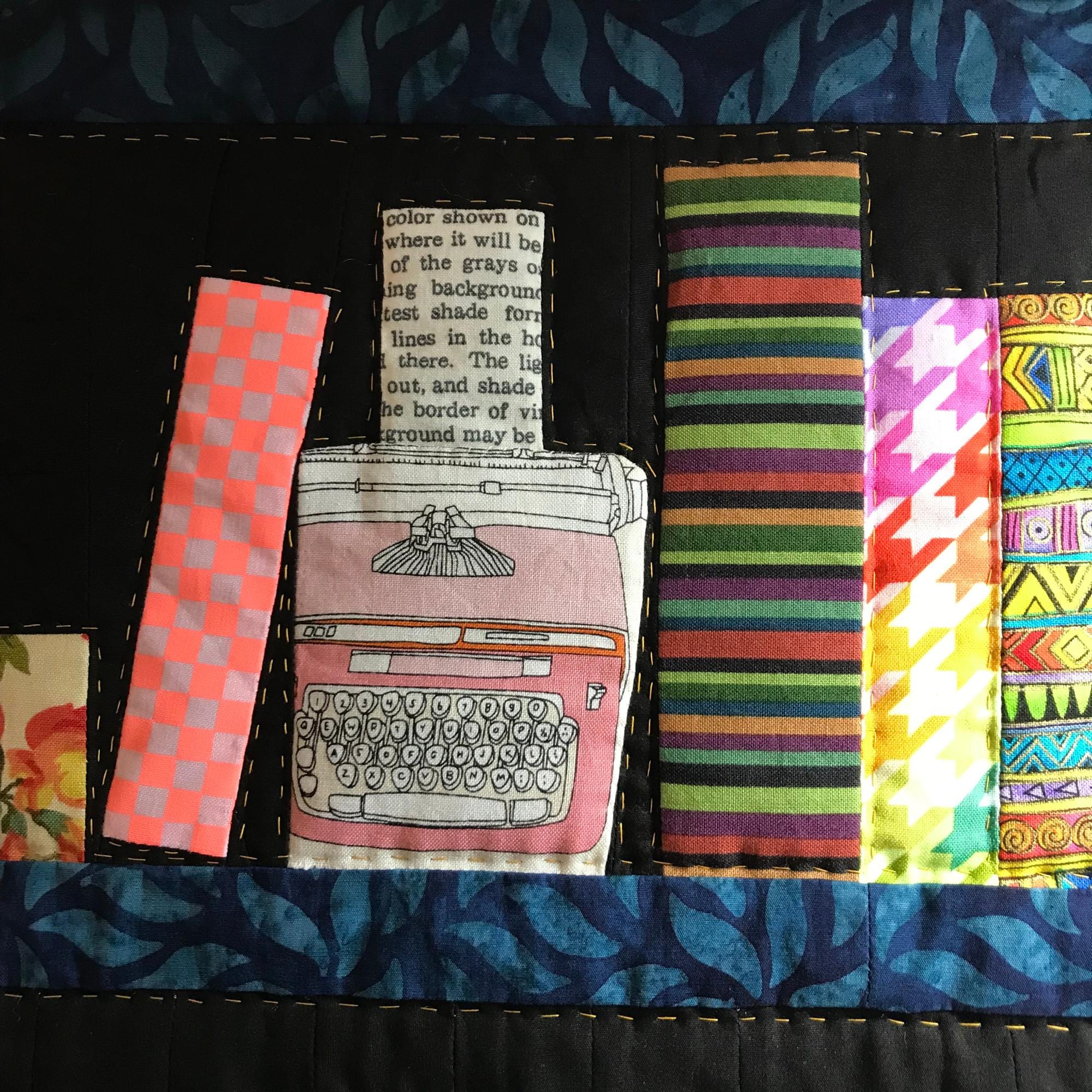*** Remember, when a book leans, only 1 corner of it touches the shelf at the bottom, so you need to sew a bit of shadow fabric to the bottom of the book strip FIRST, and more shadow at the top than you think you'll need, BEFORE attaching the leaning book - leaving some shadow for the final 1/4" seams, top and bottom.