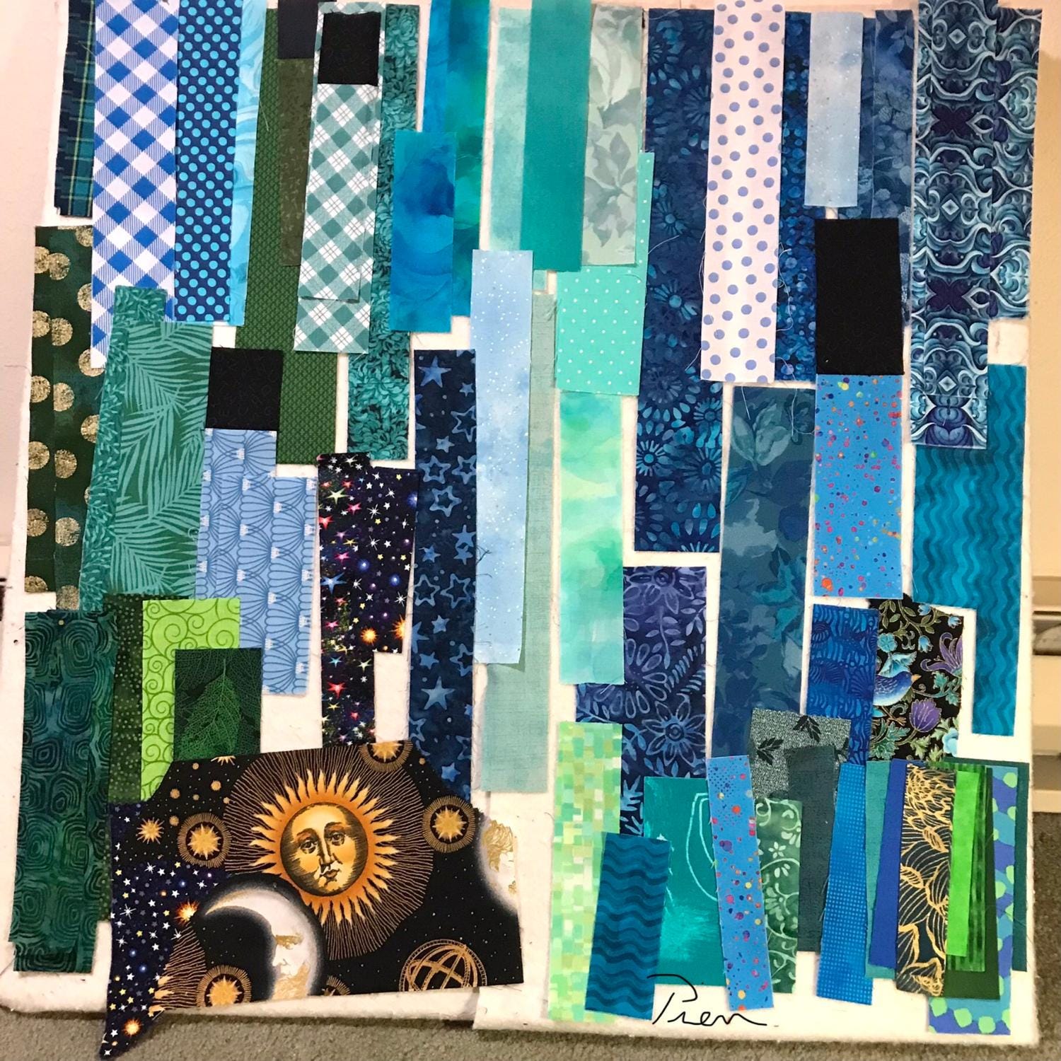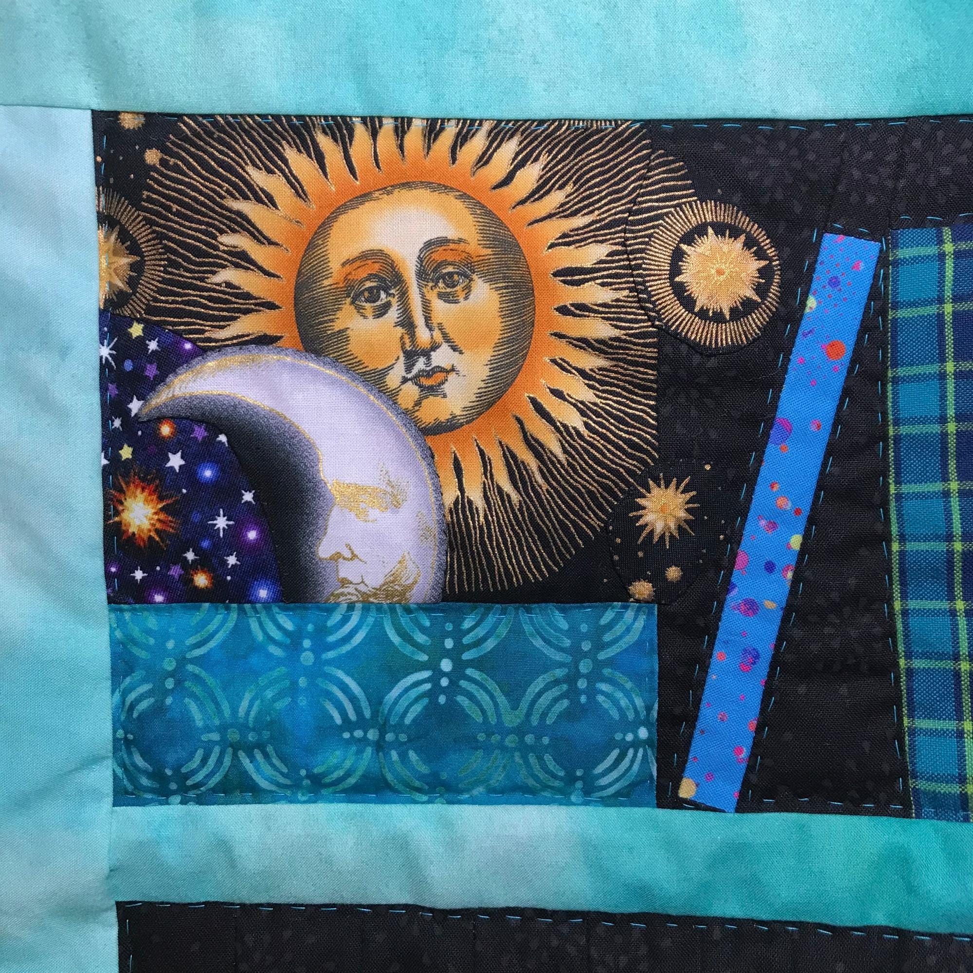 • Photos 1, 4, 12 = sun burst & moon fabric scraps with a few appliquéd stars