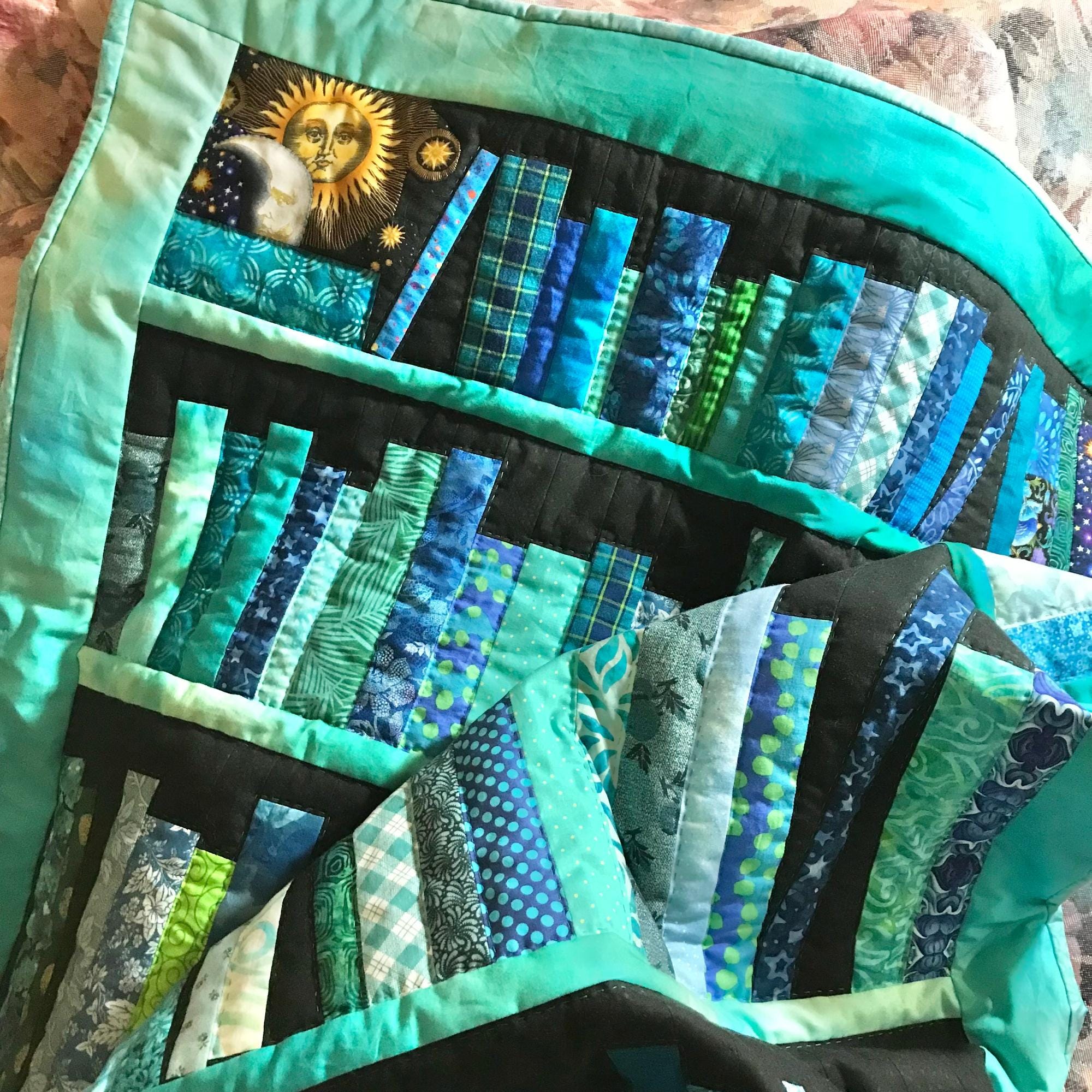 One-Of-A-Kind Book Lover's Lap quilt or wall tapestry. It was handmade using my own pattern of a turquoise blue ombré fabric design bookcase with four shelves of books (12" - 12" - 8" - 6") in blue and green cotton fabrics.