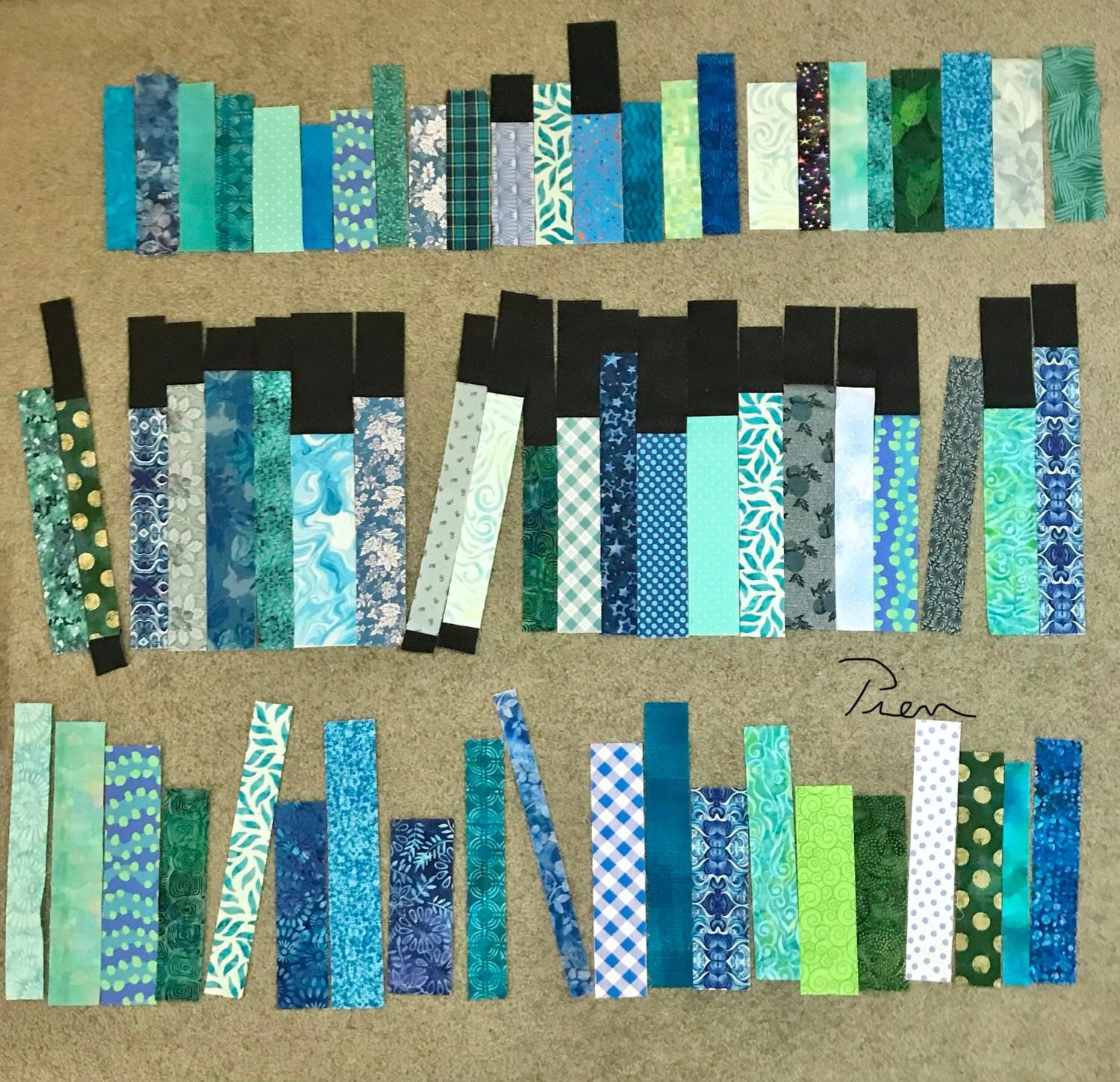 *** Remember, when a book leans, only 1 corner of it touches the shelf at the bottom, so you need to sew a bit of shadow fabric to the bottom of the book strip FIRST, and more shadow at the top than you think you'll need, BEFORE attaching the leaning book - leaving some shadow for the final 1/4" seams, top and bottom.