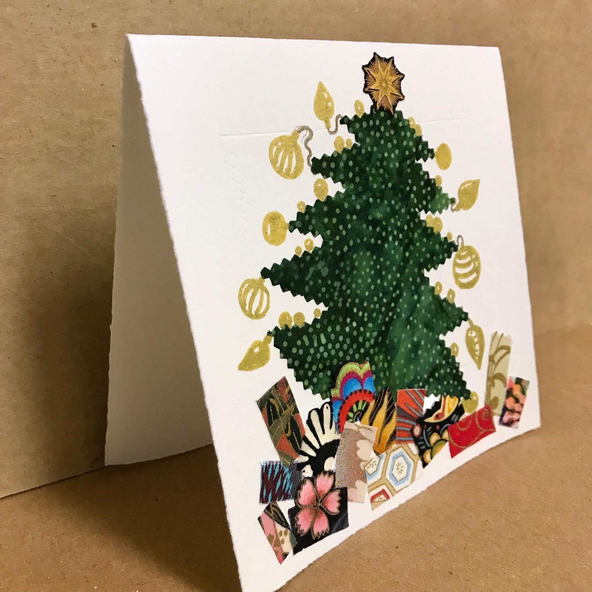 Fabric scraps and paint pens trimmed this whimsical Christmas tree card and all its colorful presents. This card is an Original ~ One-Of-A-Kind ~ (not a print)