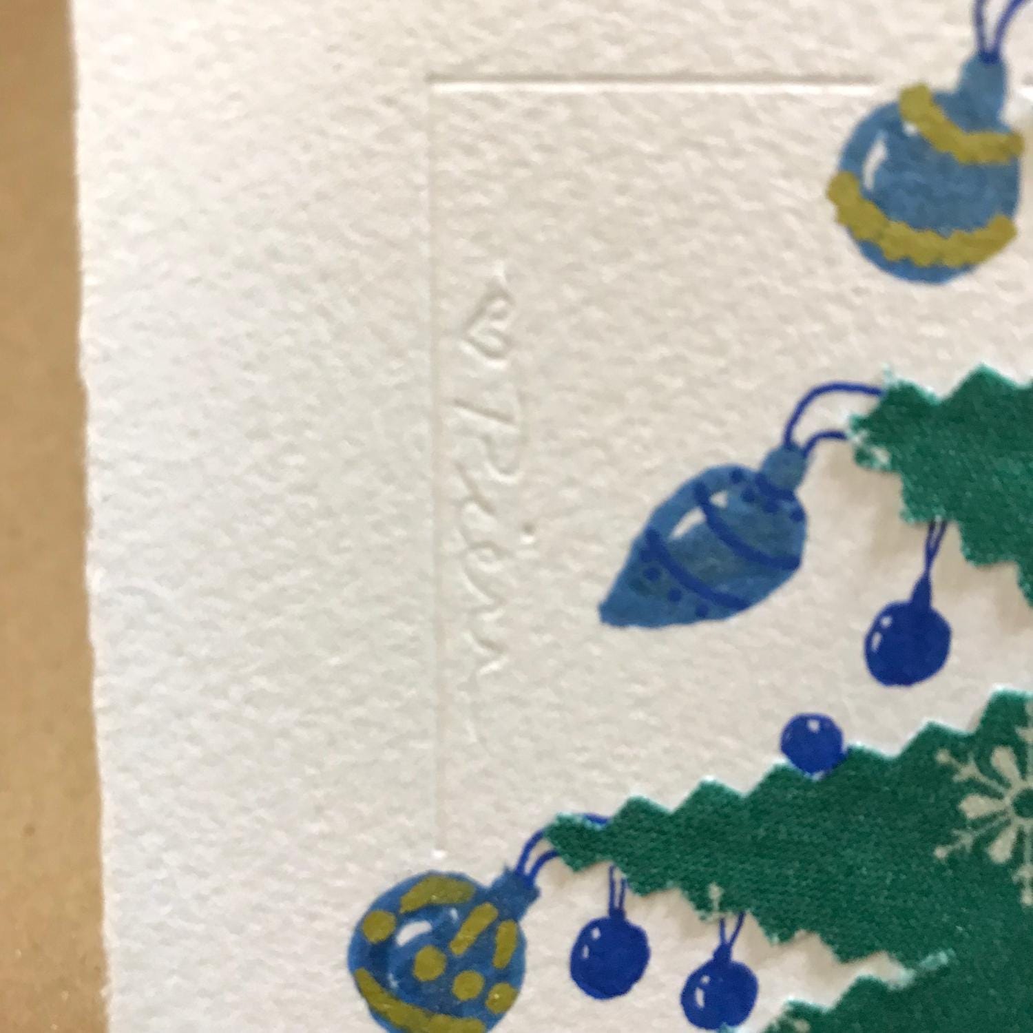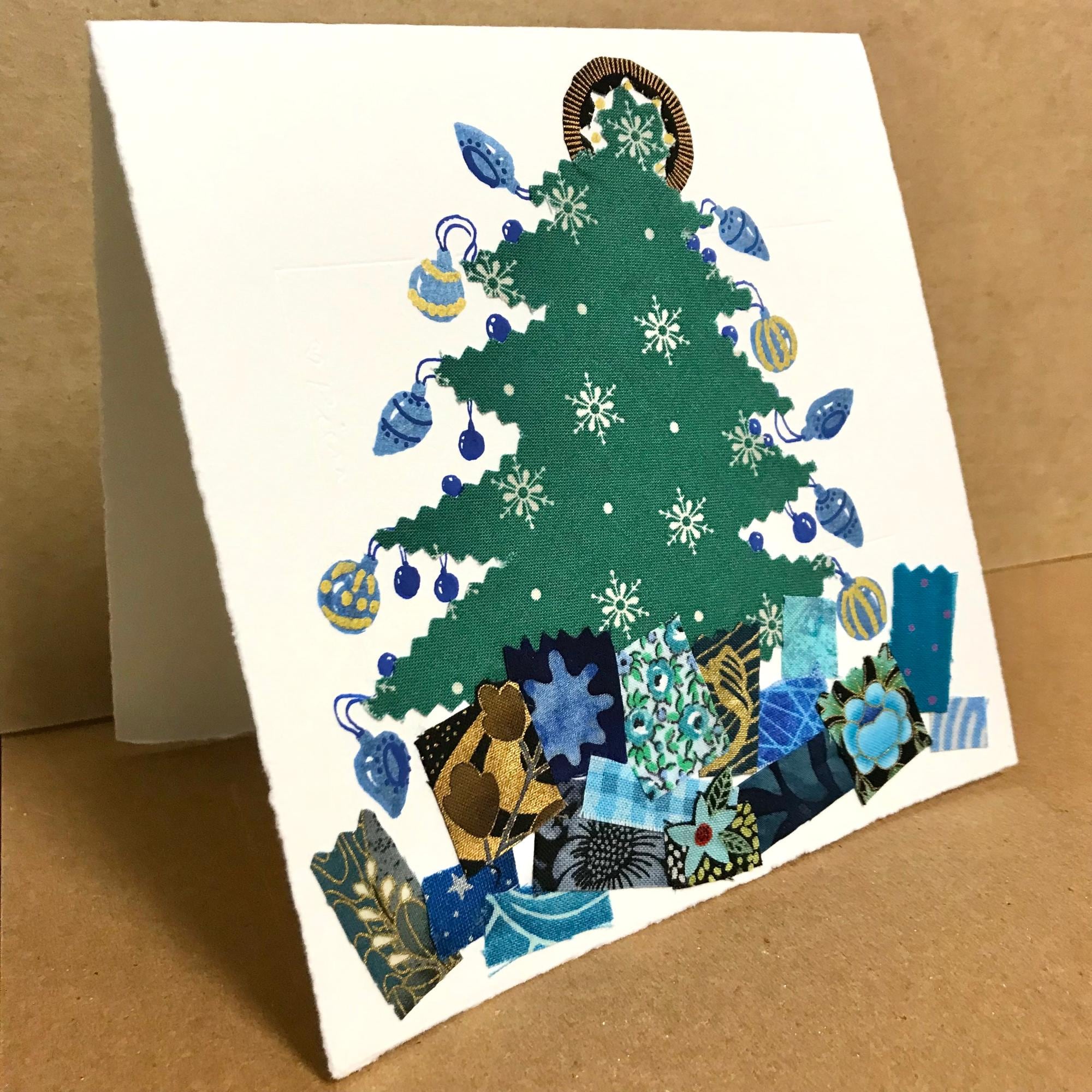 Fabric scraps and paint pens trimmed this whimsical Christmas tree card and all its gifts. This card is an Original ~ One-Of-A-Kind ~ (not a print).