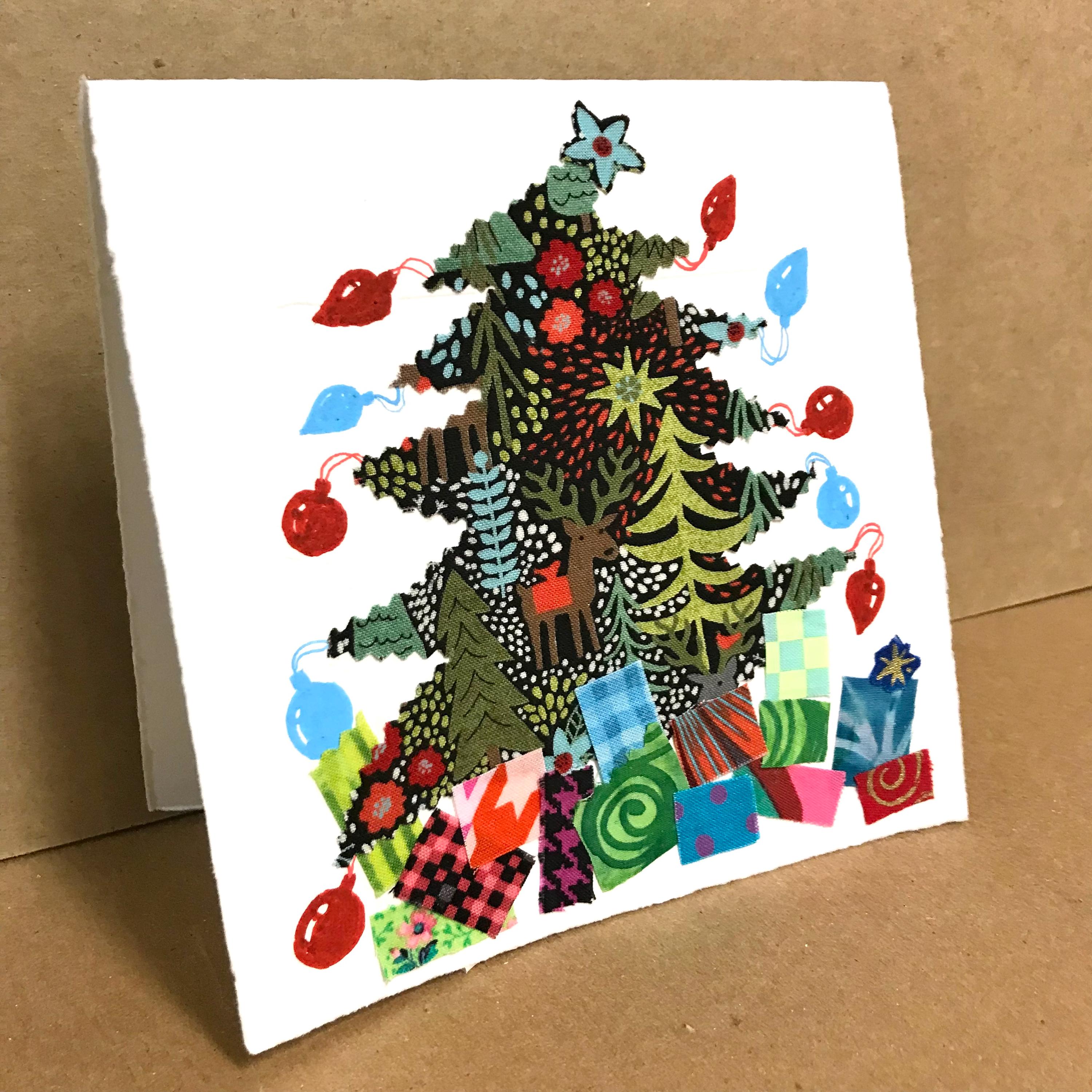 Fabric scraps and paint pens trimmed this whimsical Christmas tree card and all its gifts. This card is an Original ~ One-Of-A-Kind ~ (not a print).