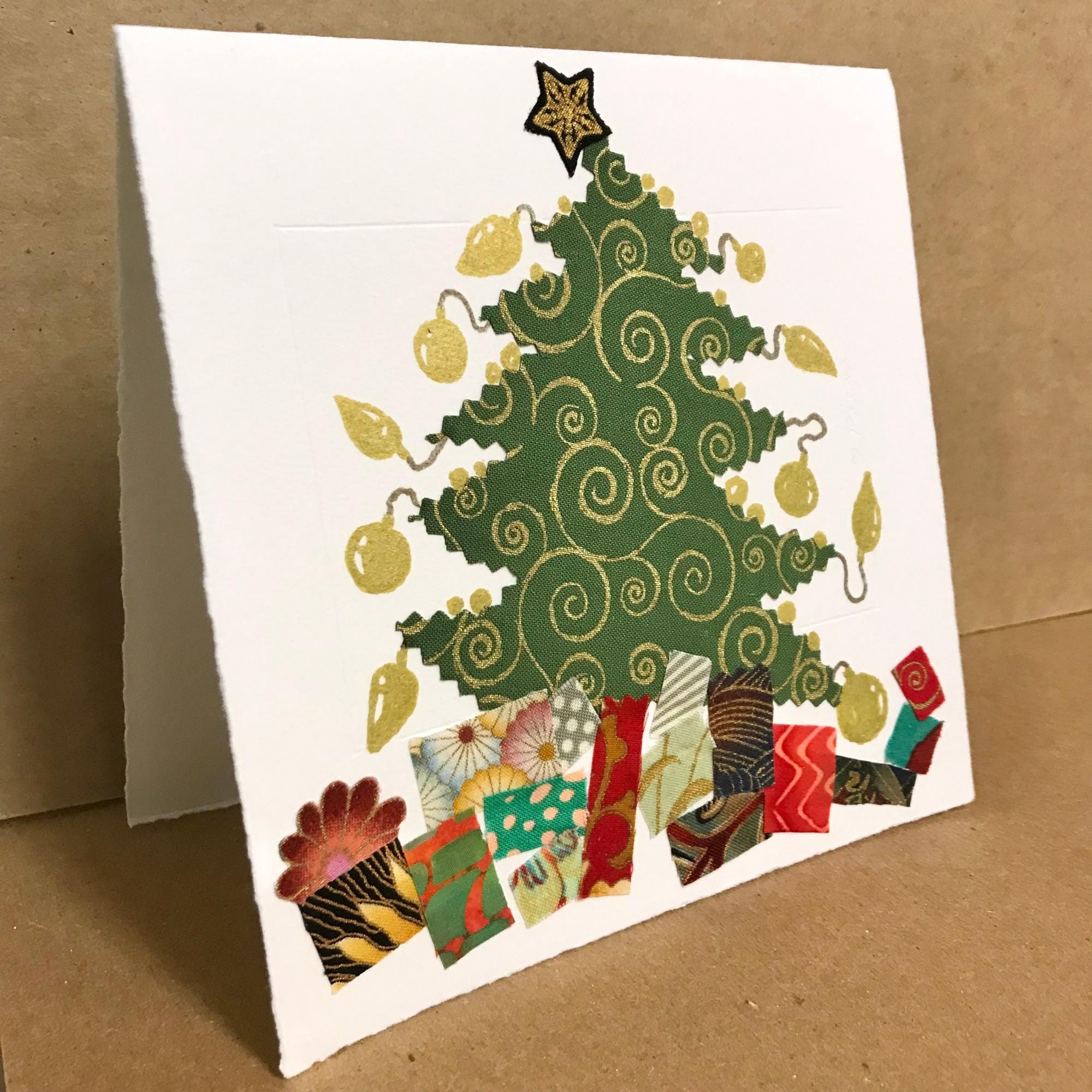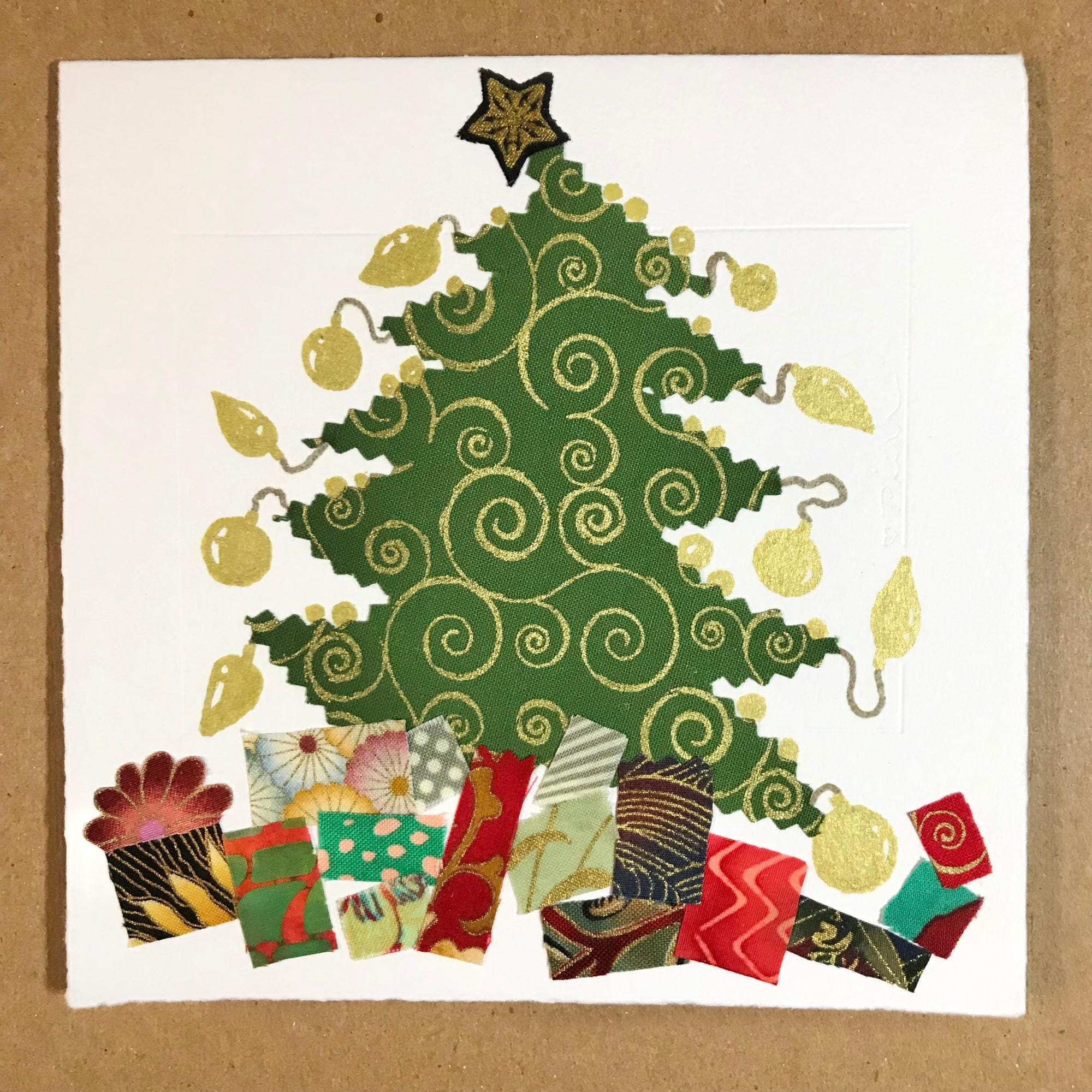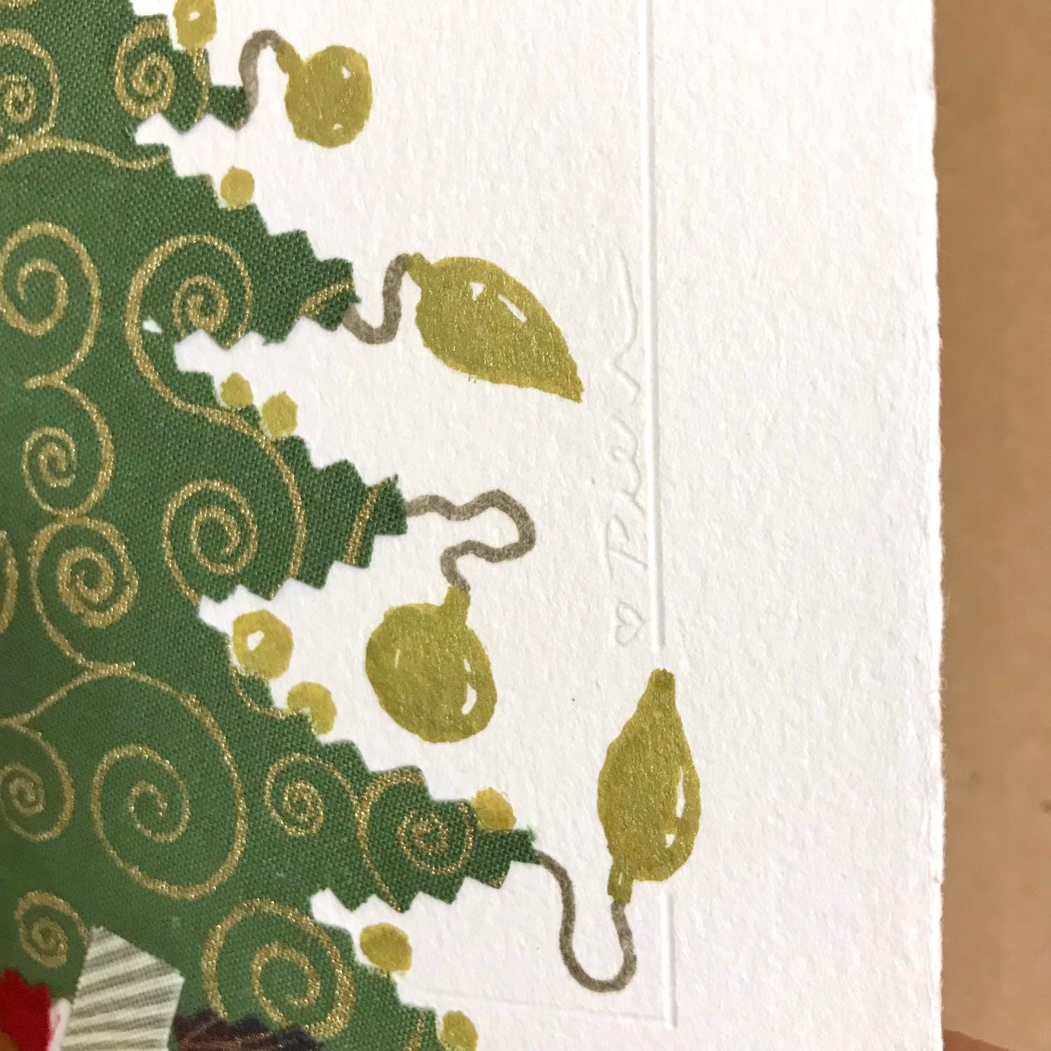 Fabric scraps and paint pens trimmed this whimsical Christmas tree card and all its gifts. This card is an Original ~ One-Of-A-Kind ~ (not a print)
