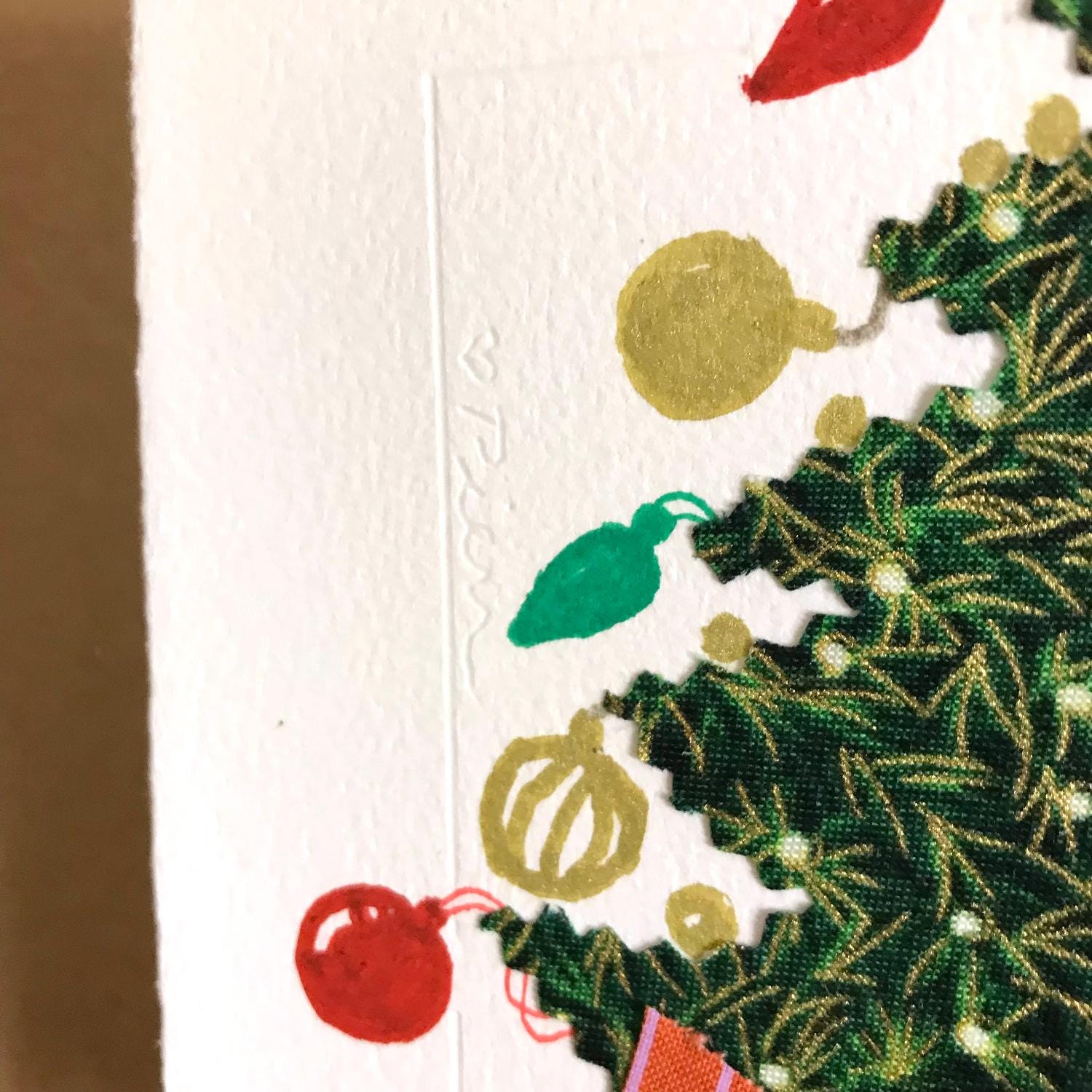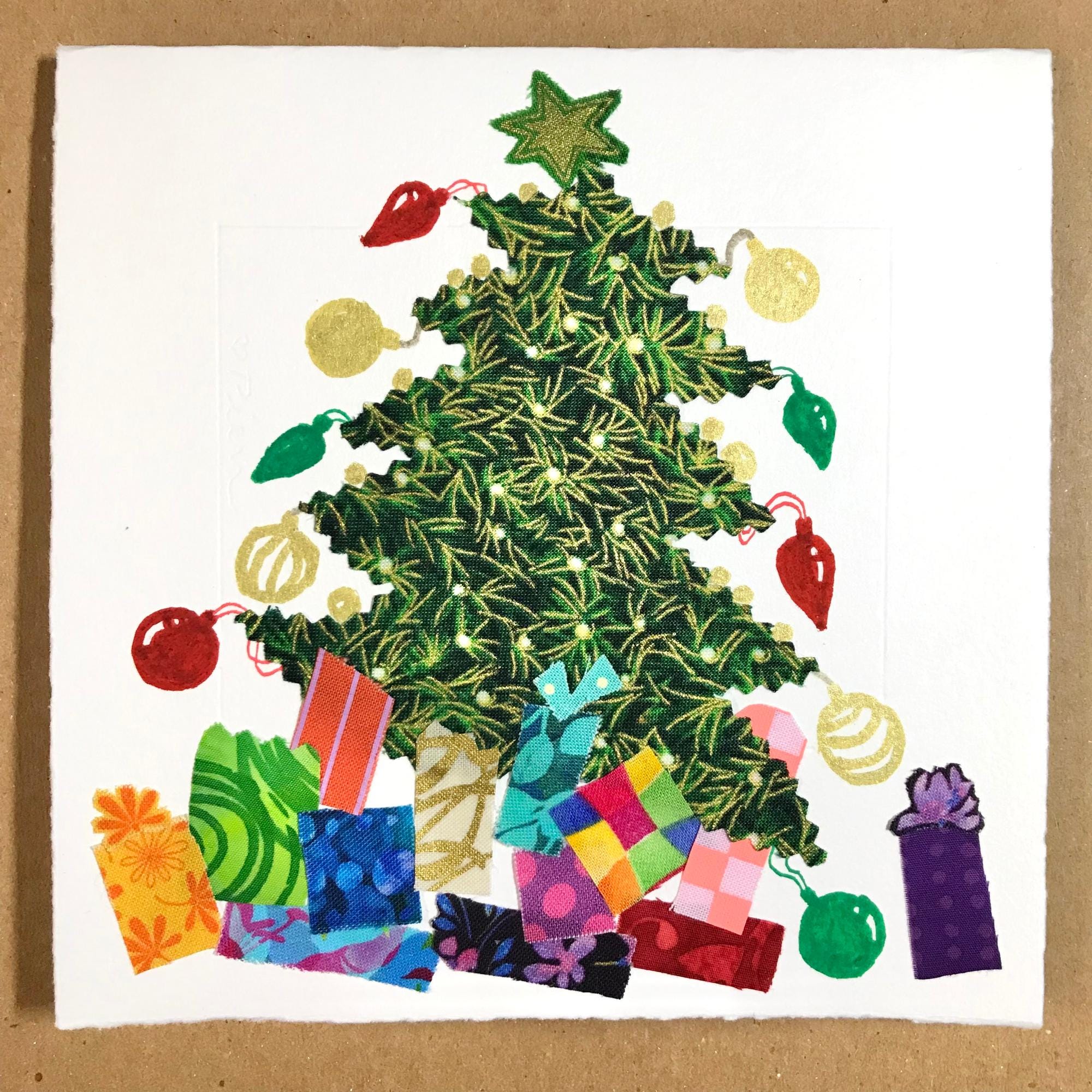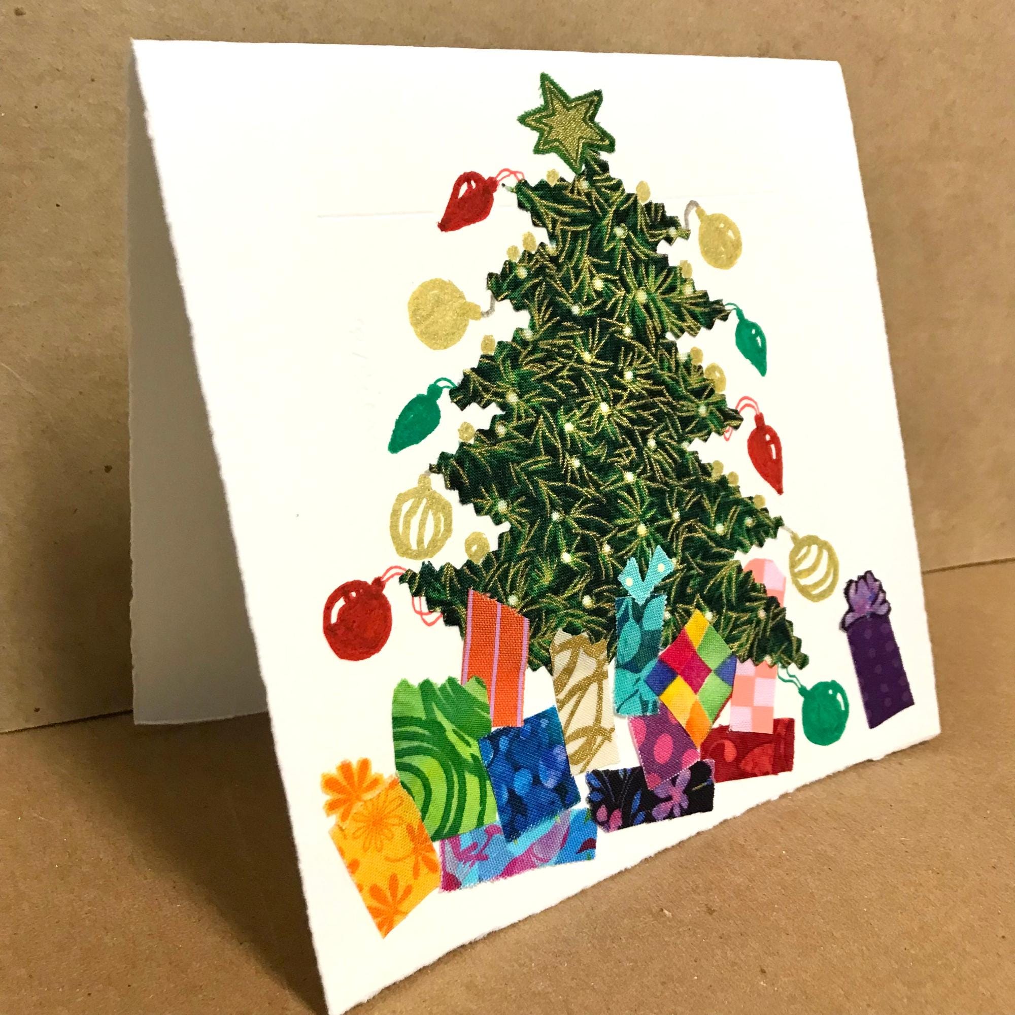 Fabric scraps and paint pens trimmed this whimsical Christmas tree and all its gifts. This card is an Original ~ One-Of-A-Kind ~ (not a print).
