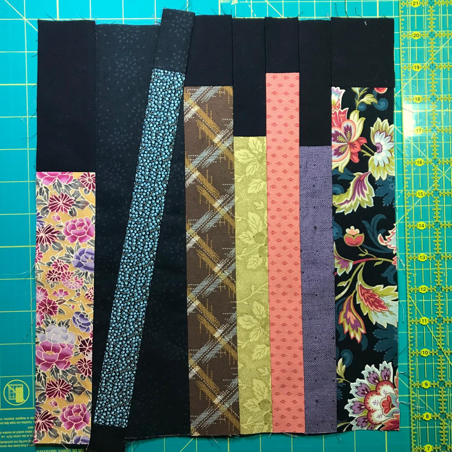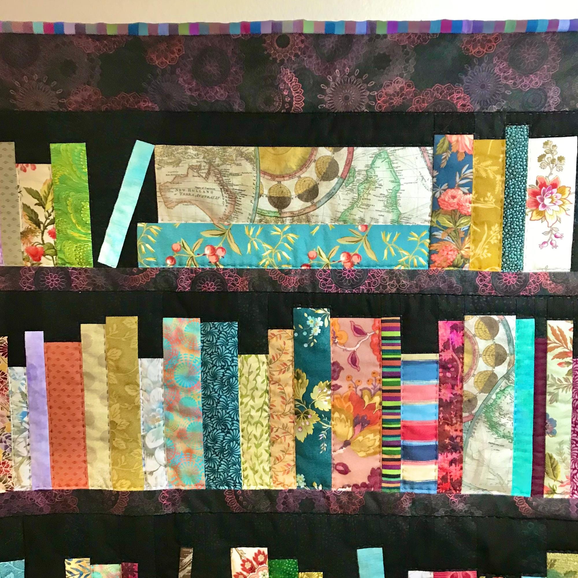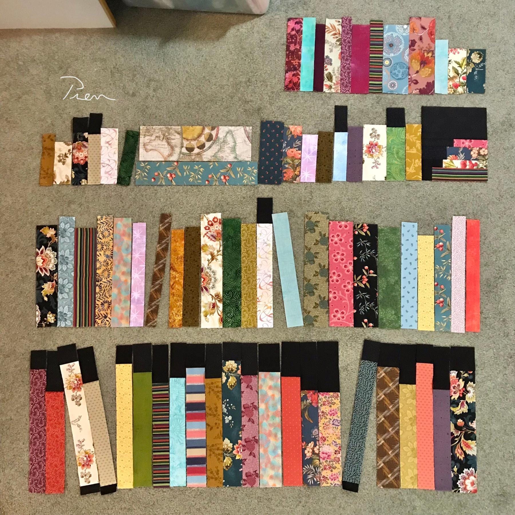 *** Remember, when a book leans, only 1 corner of it touches the shelf at the bottom, so you need to sew a bit of shadow fabric to the bottom of the book strip FIRST, and more shadow at the top than you think you'll need, BEFORE attaching the leaning book - leaving some shadow for the final 1/4" seams, top and bottom.