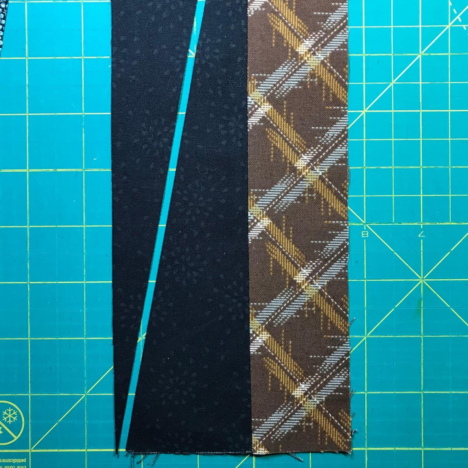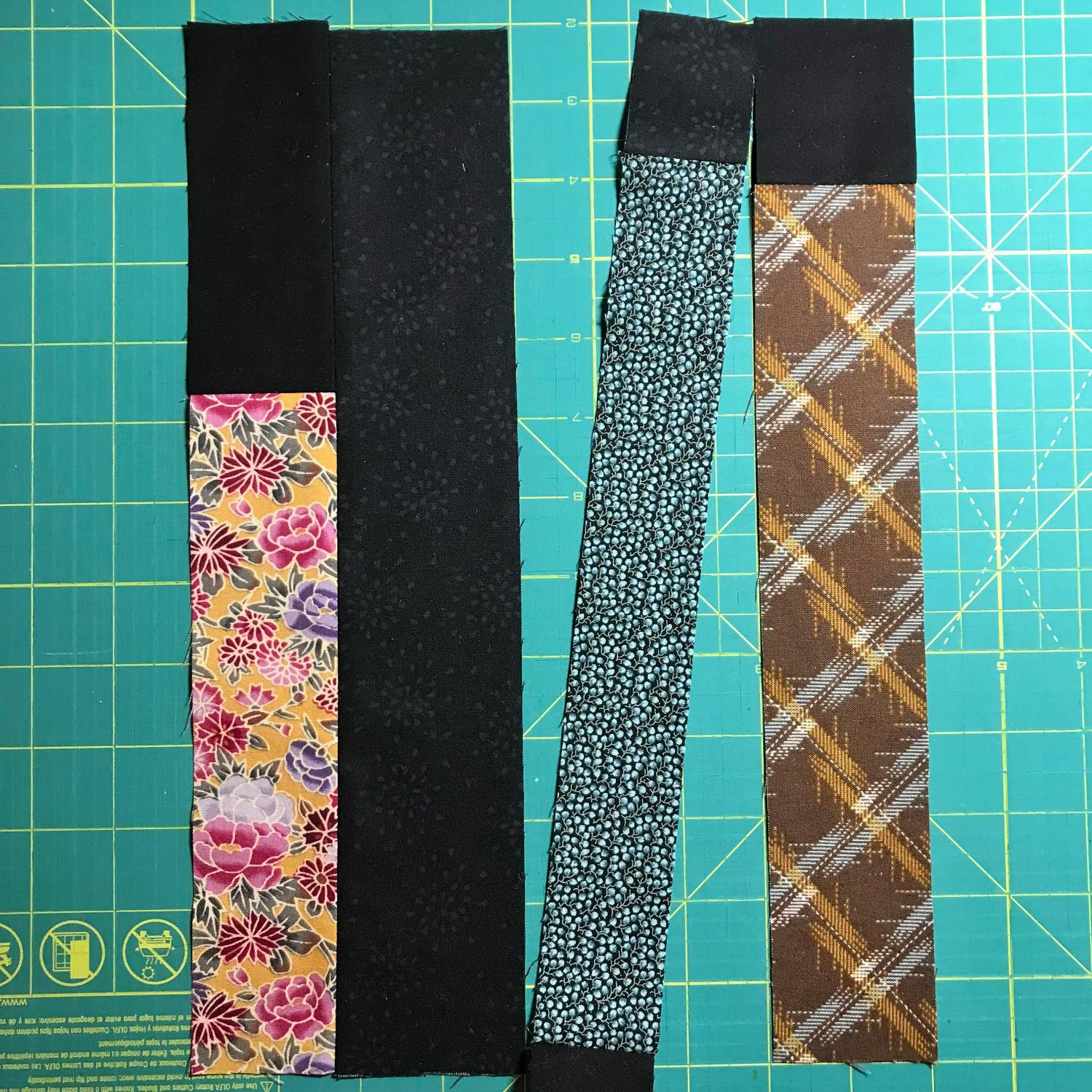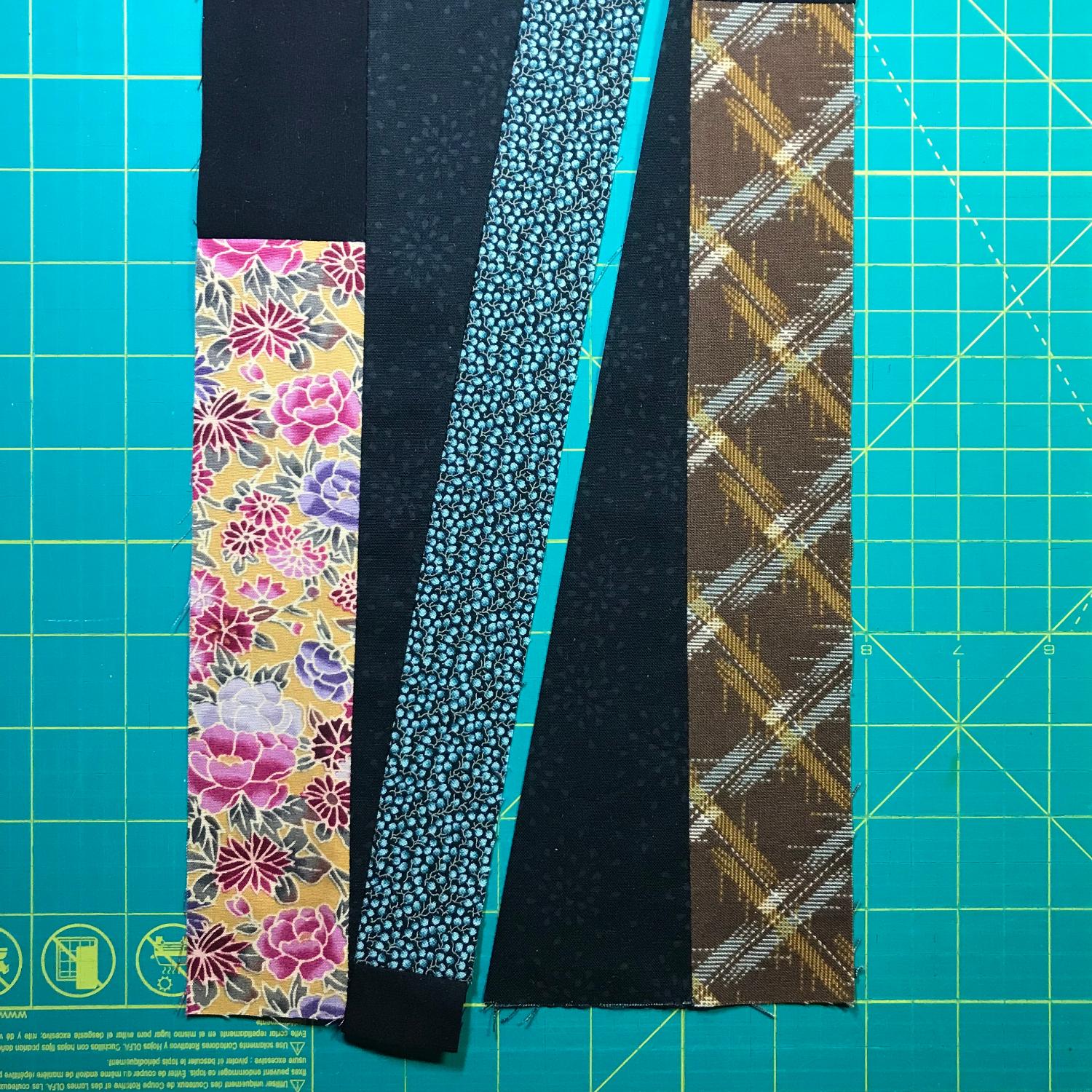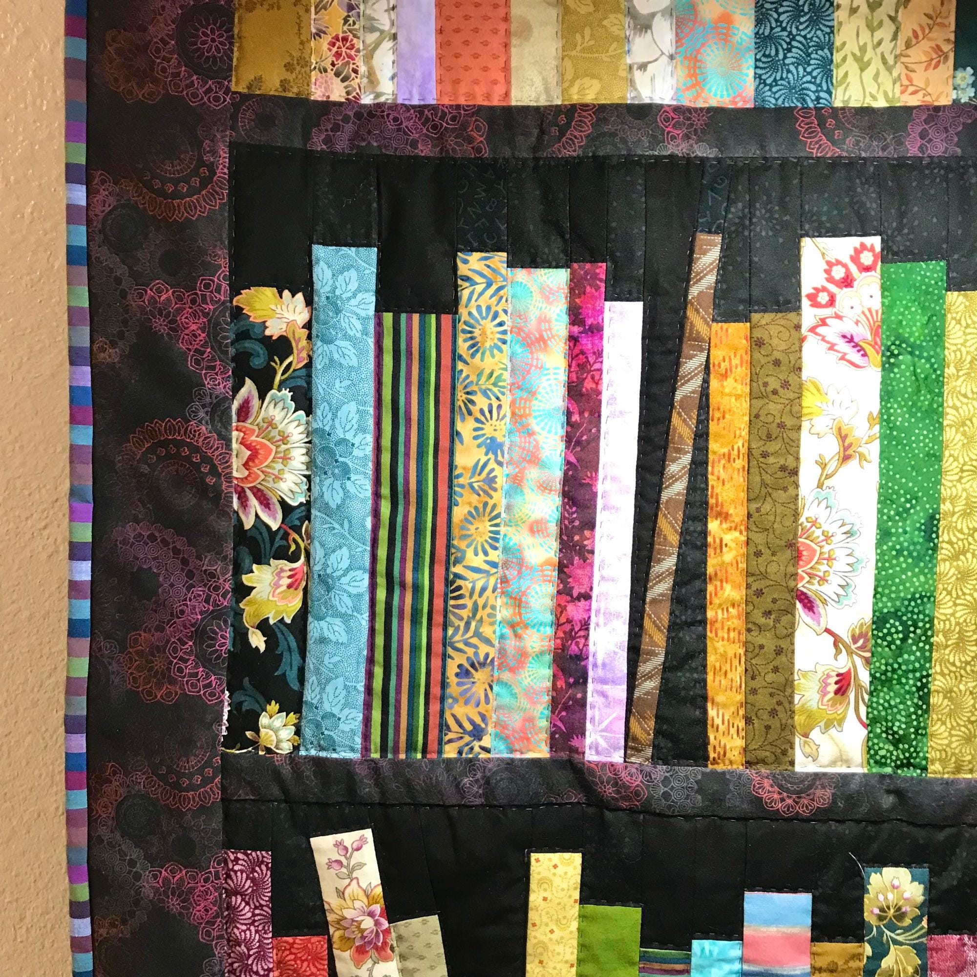 *** Remember, when a book leans, only 1 corner of it touches the shelf at the bottom, so you need to sew a bit of shadow fabric to the bottom of the book strip FIRST, and more shadow at the top than you think you'll need, BEFORE attaching the leaning book - leaving some shadow for the final 1/4" seams, top and bottom.