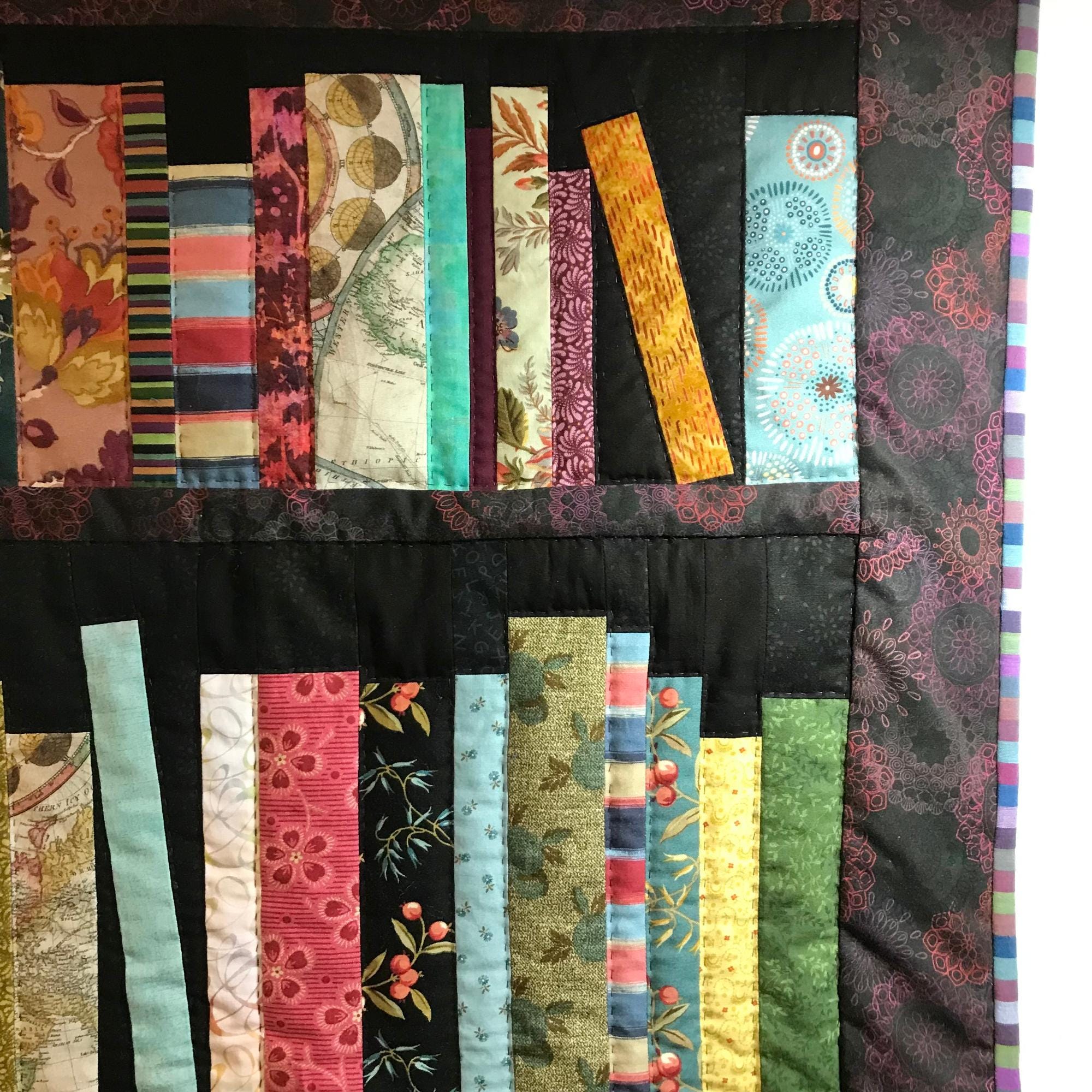 I myself figured it out from a photograph. A crafty friend had saved a magazine photo of one for 40 years!! hoping to some day make it, but asked if I would for her, instead. I took one look at that quilt draped over the back of a chair and it thrilled me. I couldn't believe how REAL it looked. I wanted to make it right away - and I did...a KING-SIZE (Photo 18) - using my crafty friend's fabrics, hardly making a tiny dent in her extensive stash. She cut the brown cabinet fabrics and sewed my 4 rows of books onto their brown shelves, and then she EMBROIDERED titles on many of the books. Incredible. She and her husband dream beneath this magical library every night.