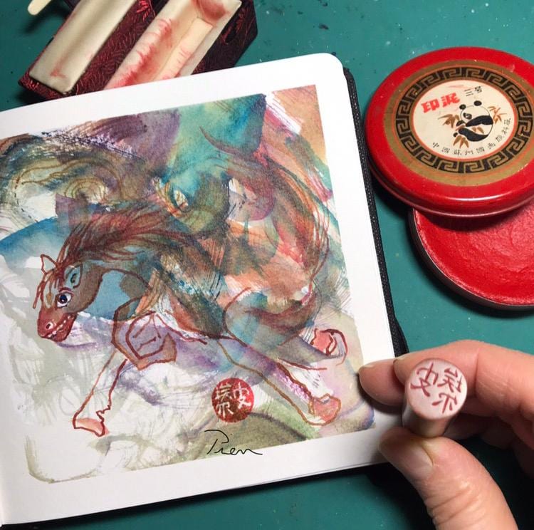 • signed in red ink with my personal Chop (Photo 4) sounding "pea" + "ear" = Pierr