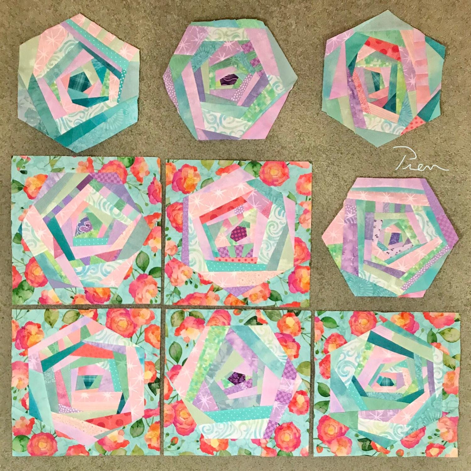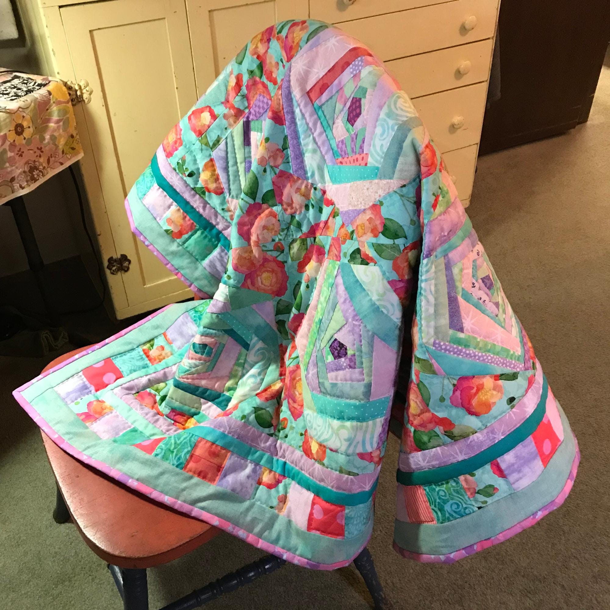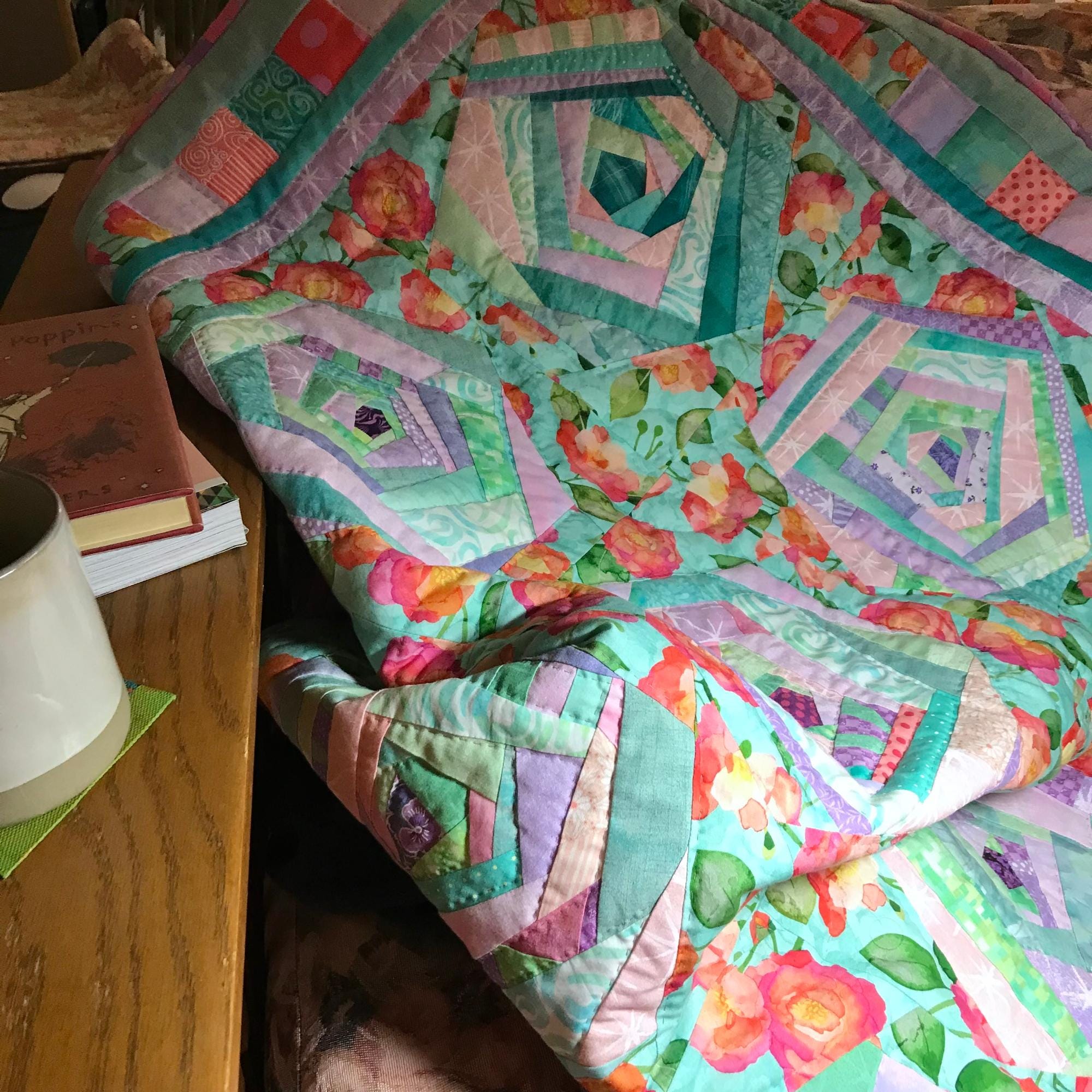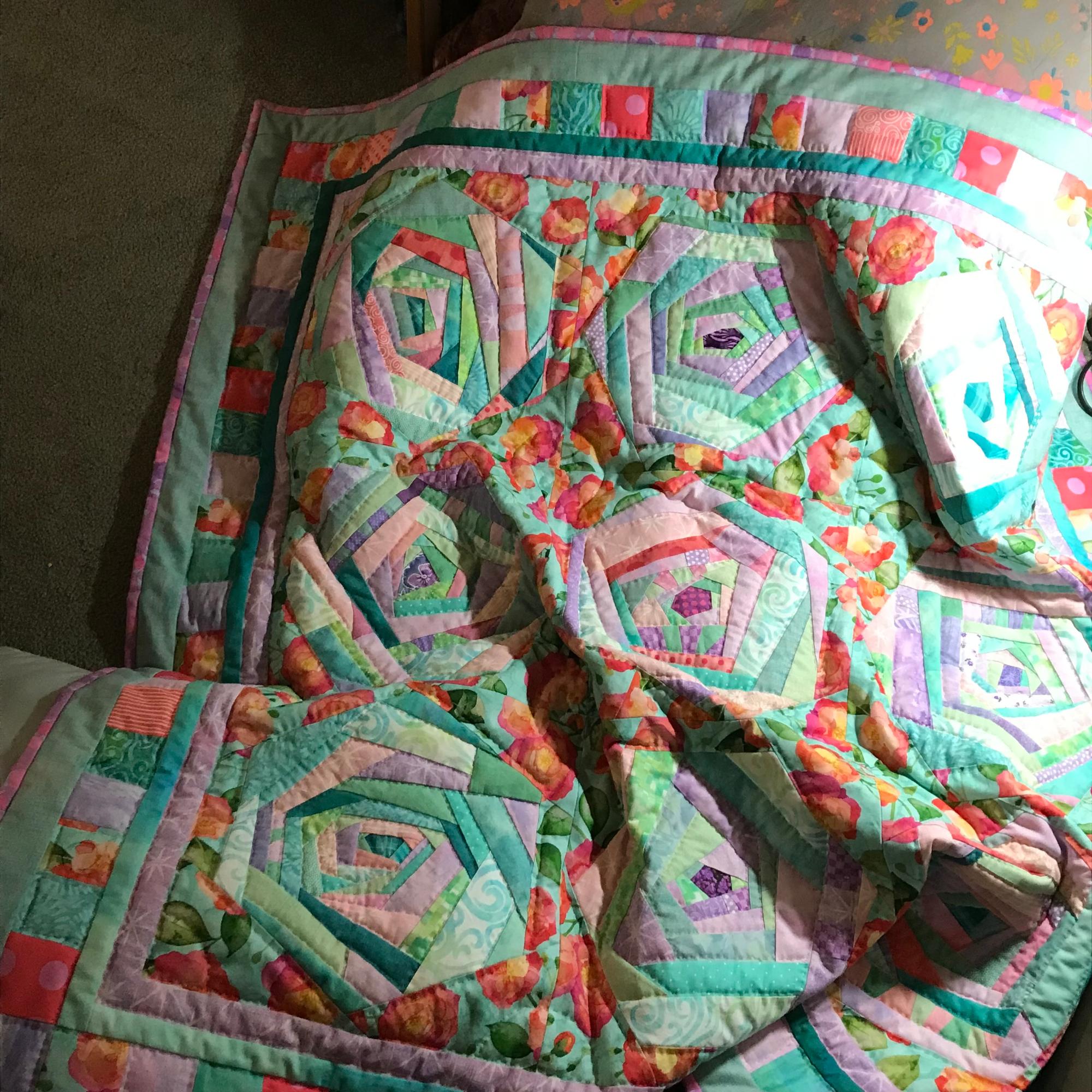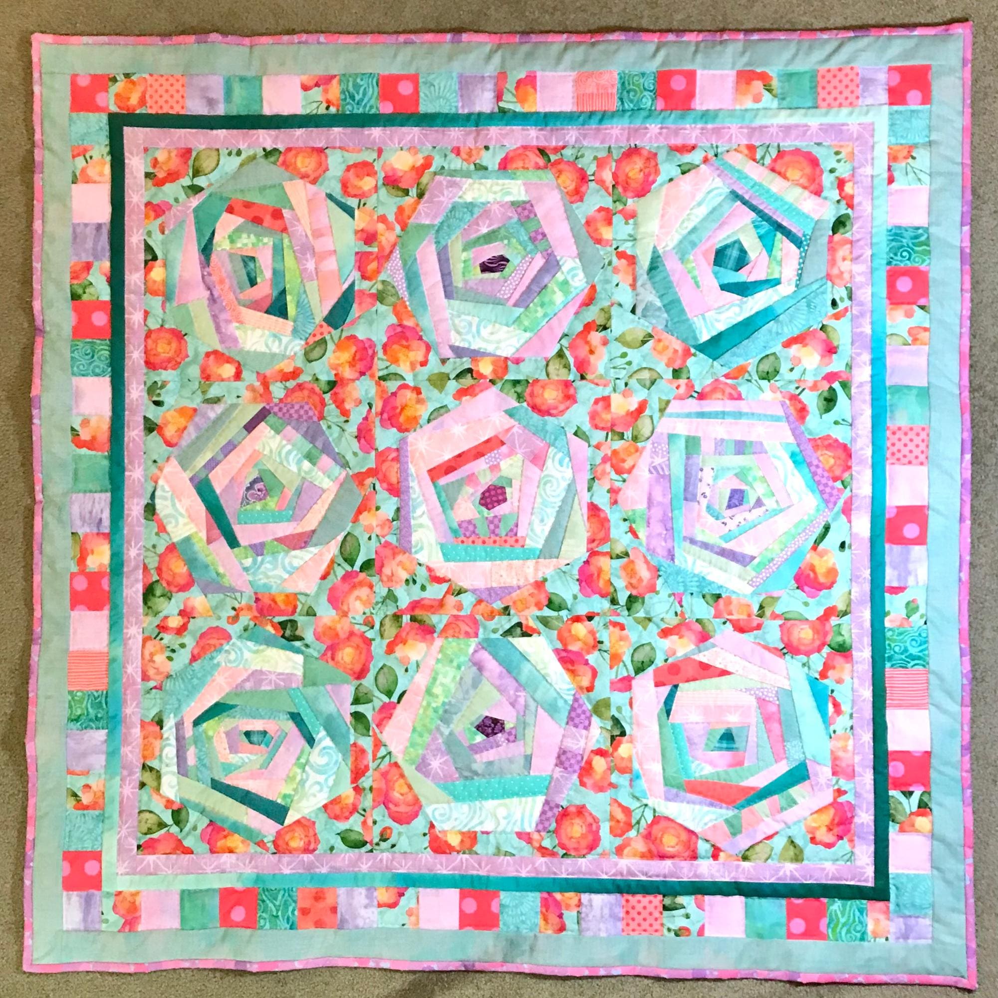 Springtime cozy quilt of lavender, pink, green and turquoise fabric scraps stitched into 9 wonky Log Cabin hexagon blocks, then set in a bed of pinky-orange roses, with a border of colorful squares. Perfect for a picnic, baby-watching, or reading and napping on the couch.