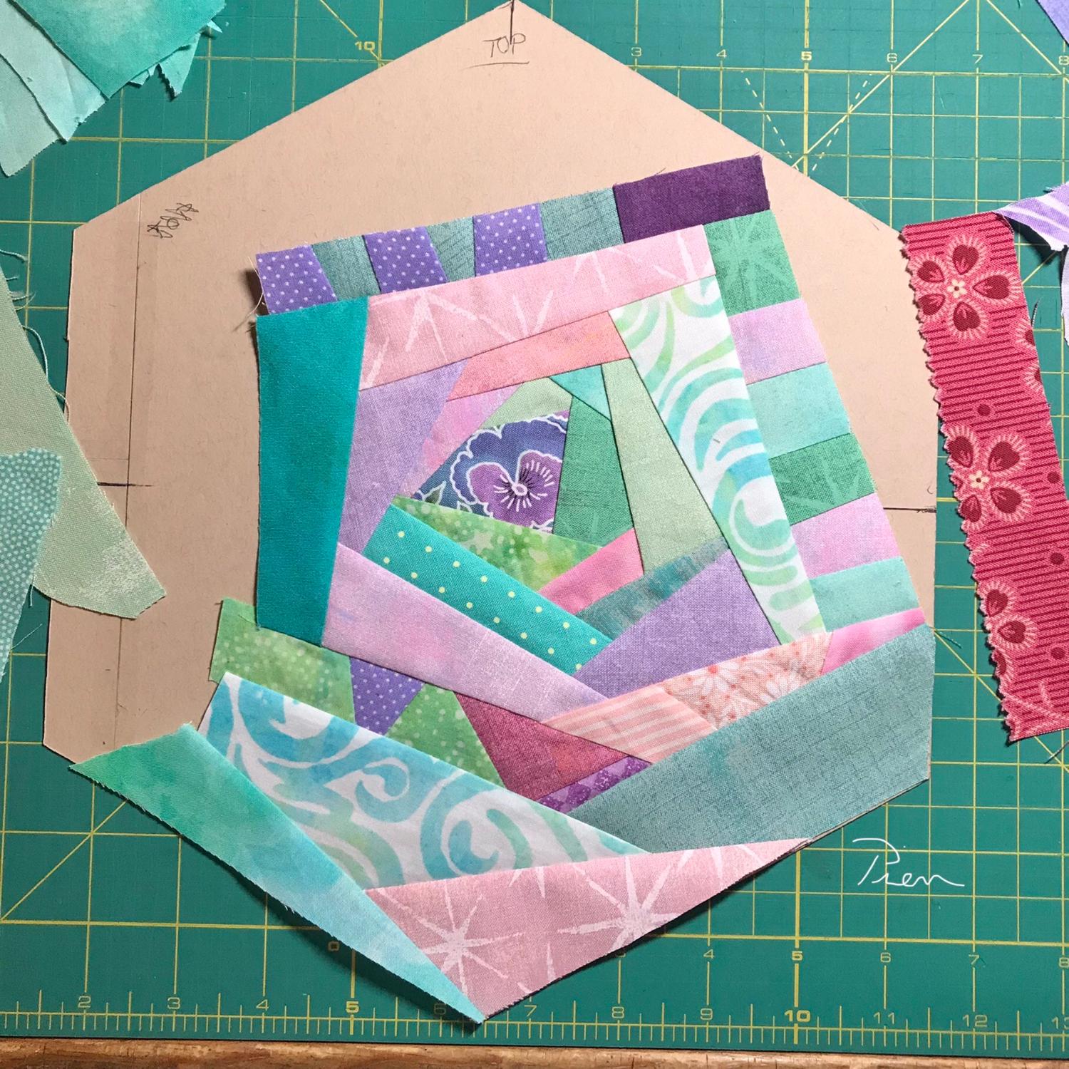 • 9 hexagons made with fabric scraps in a wonky Log Cabin pattern
